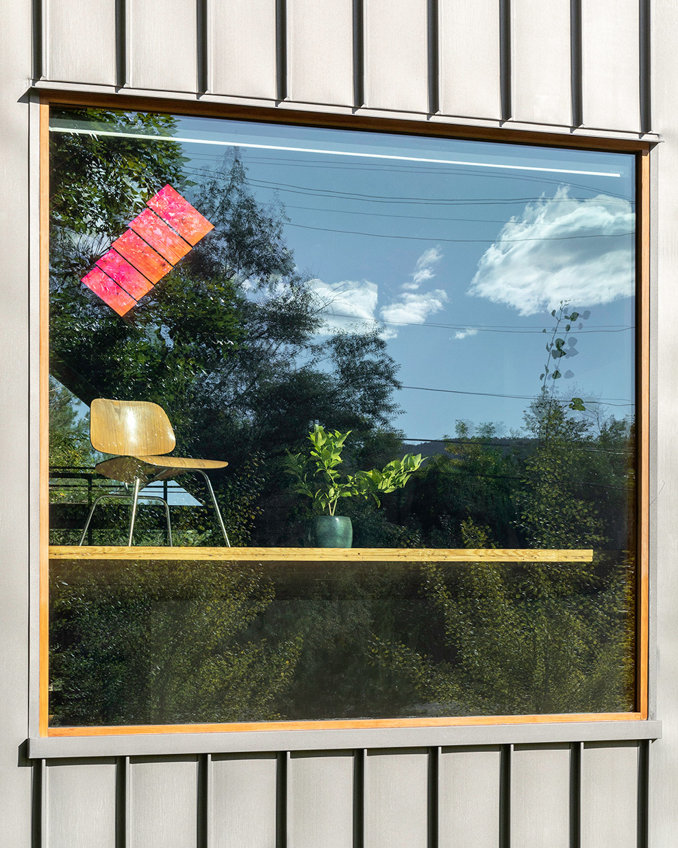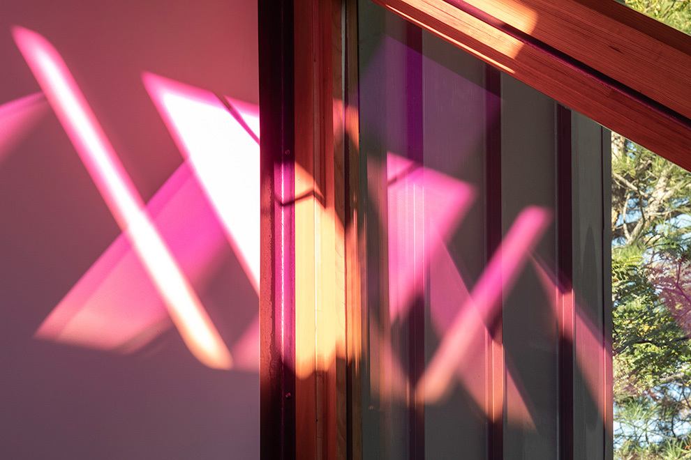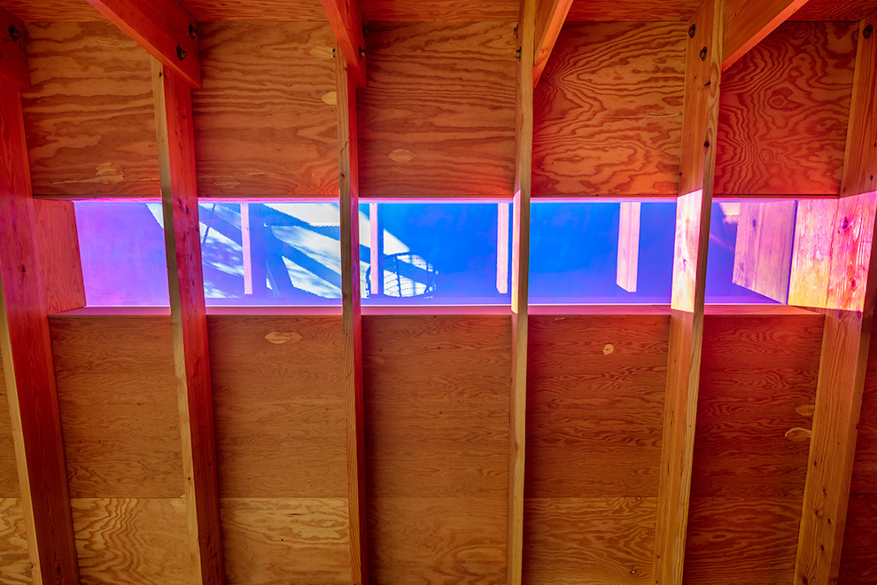This small home is made primarily of reclaimed bowling alley lanes and plywood. The 50 year old bowling alley wood is used as a structurally independent mezzanine floor system. Reject tile from a Boulder artisan is used throughout the bathroom and in the kitchen. The skylight is made from a dichroic glass panel that was a rejected stock from a past Tres Birds project. As the angle of the sun changes throughout the day and season, so do the light/color effects within the living space, creating a vibrant show of colored light throughout. Window locations and roof overhangs were designed specifically to maximize natural light in the home while providing adequate shading for summer sun. In the winter, the continuous standing seam exterior is designed to be low maintenance and to quickly shed snow with its 12:12 roof pitch.
