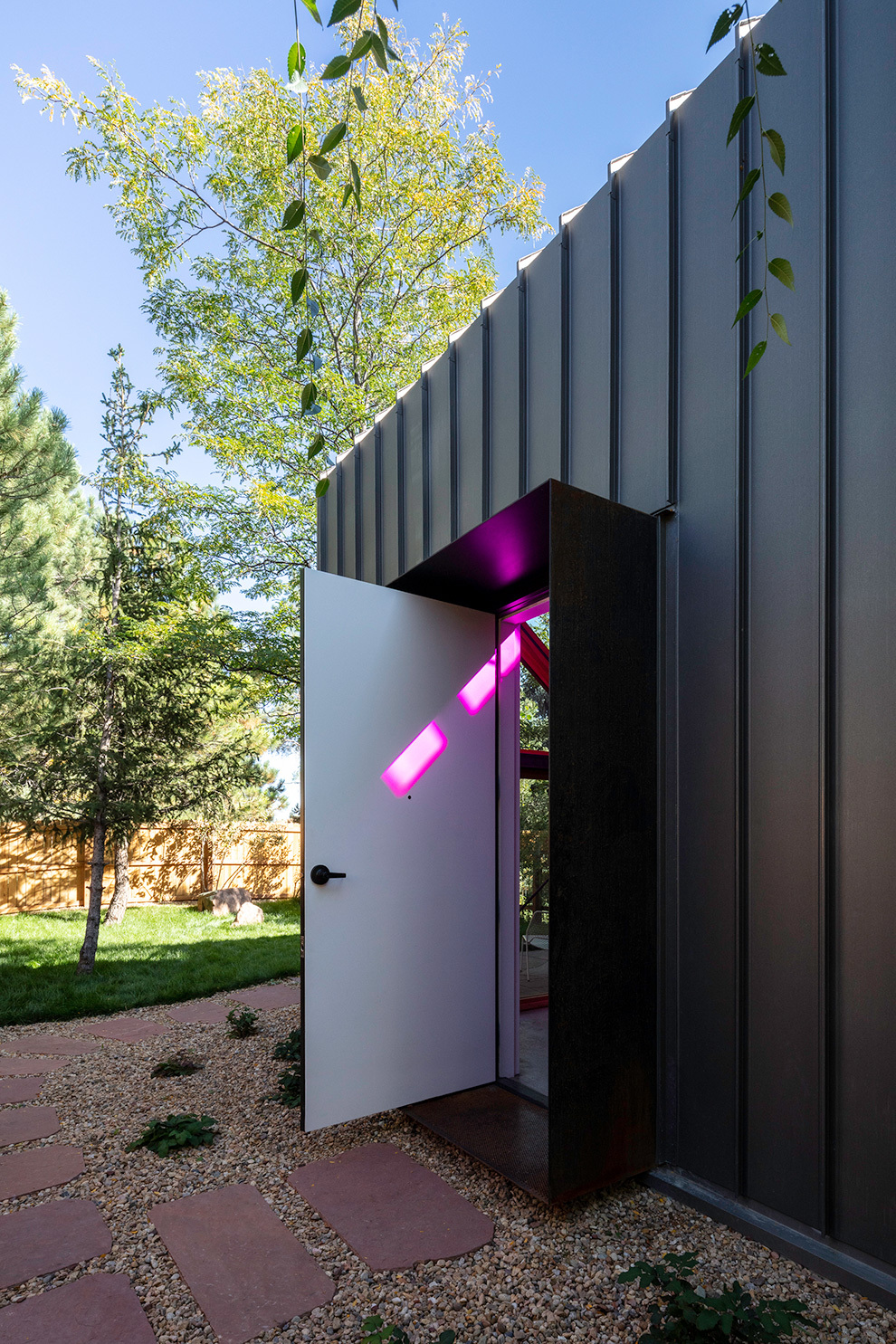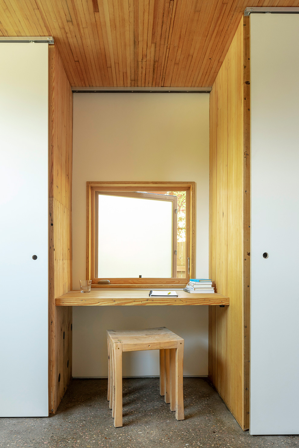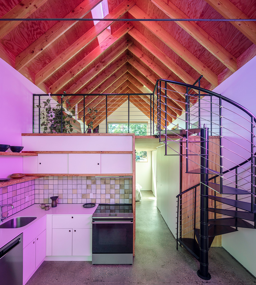 The ADU scores well for energy efficiency. The envelope is tight and well insulated. Radiant floor heating and cooling keep the climate comfortable. Lighting, security, HVAC, and the operable skylight can all be controlled by the occupant’s phone, cutting down on energy waste. The home received a Home Energy Rating System (HERS) score of 33, not far off from Europe’s stringent Passive House requirement of HERS 20. For reference, a new standard home scores HERS 100 and an Energy Smart home scores HERS 85.