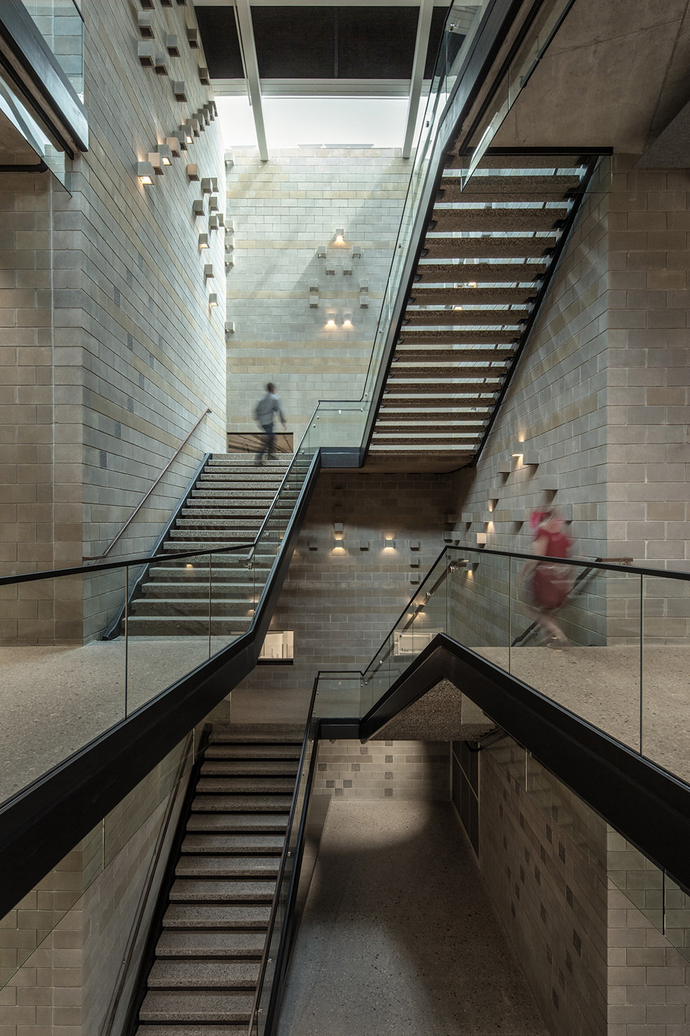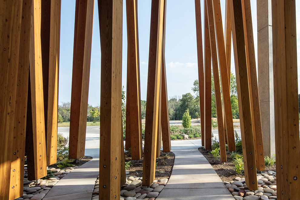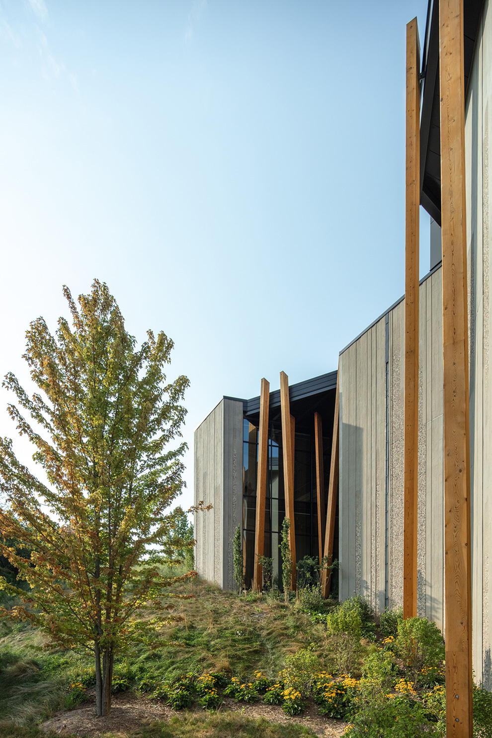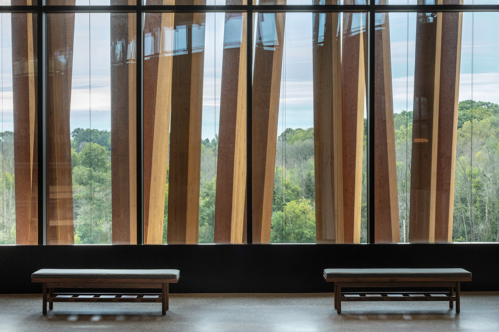 To access the main entry at level 1, the visitor moves through a forest of soaring timbers. These timbers serve three purposes: they assist with solar shading of the museum’s largest southern windows, they echo the hillside trees in rhythm and stance, and they create a procession through the “woods” into the museum.