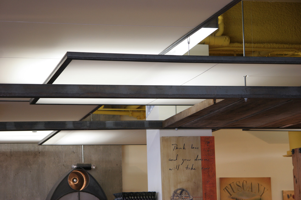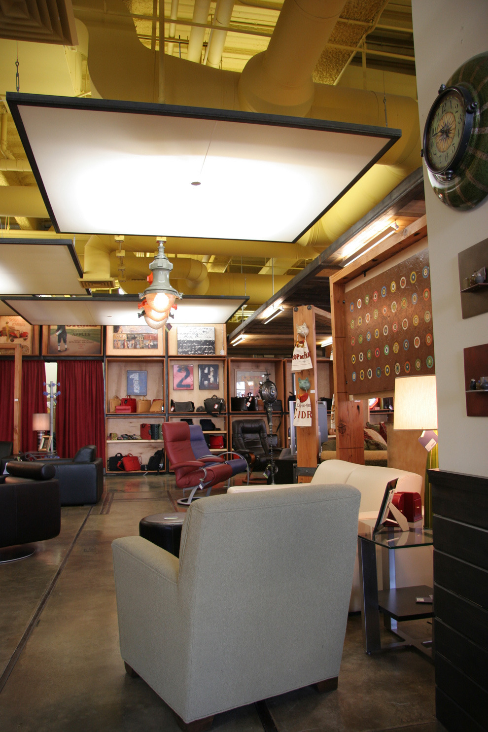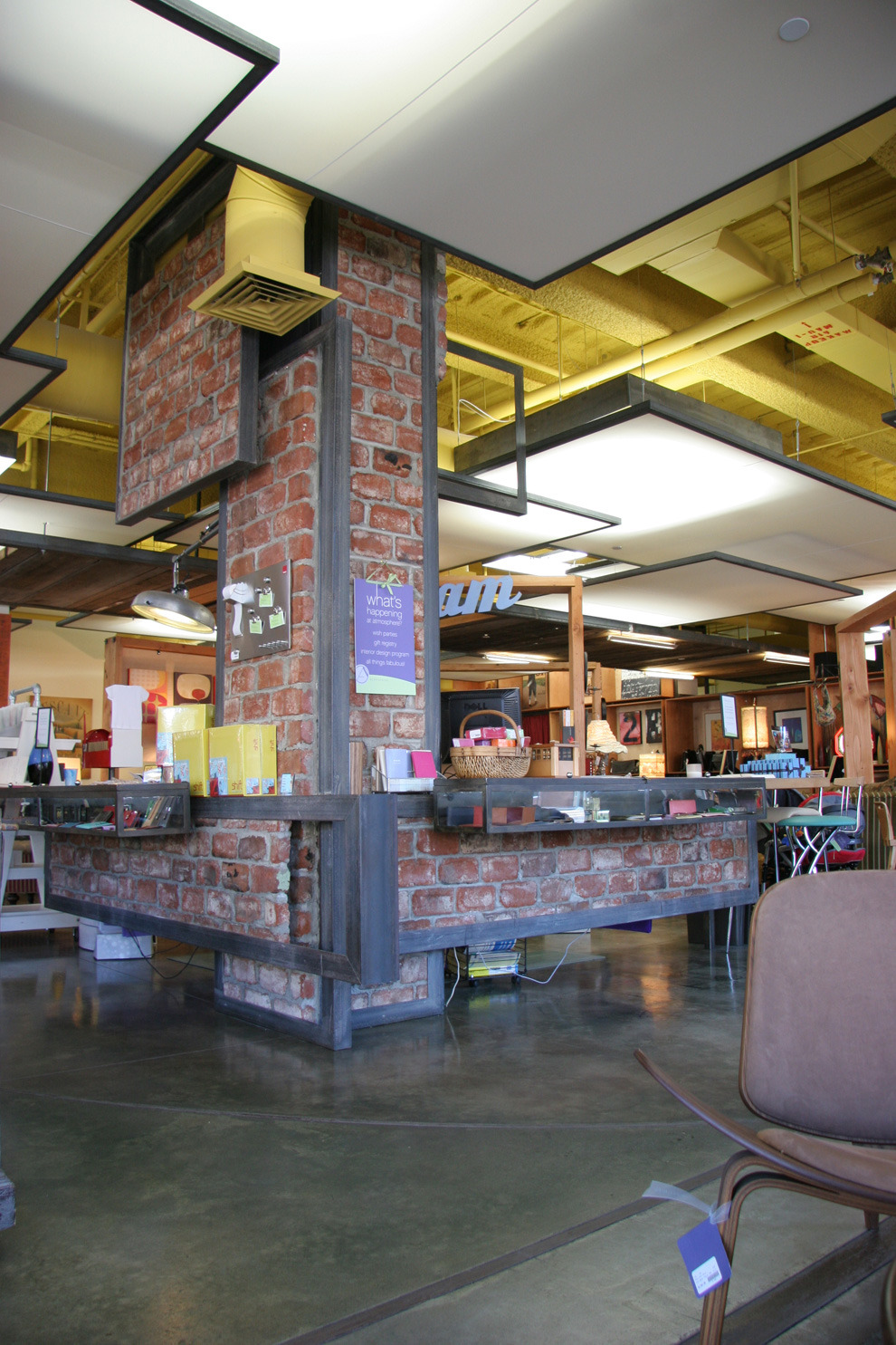 As the client describes it, 'atmosphere' is the idea and act of 'rising'. Vignettes are created for this boutique of fine furnishings and goods. Like a stage setting, the space has movable walls and a cloud-like variable lighting system. It adapts to changes in merchandise and daily/ seasonal changes of outdoor light. Stained concrete floor with circular wood inlay pattern guides pedestrians.