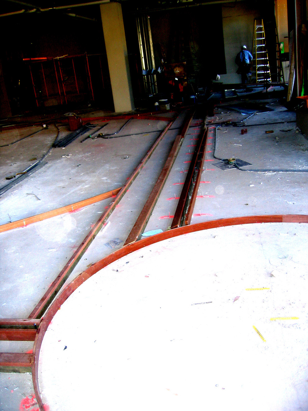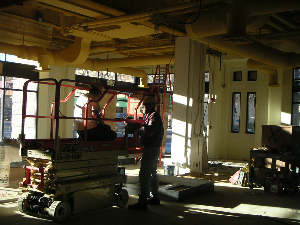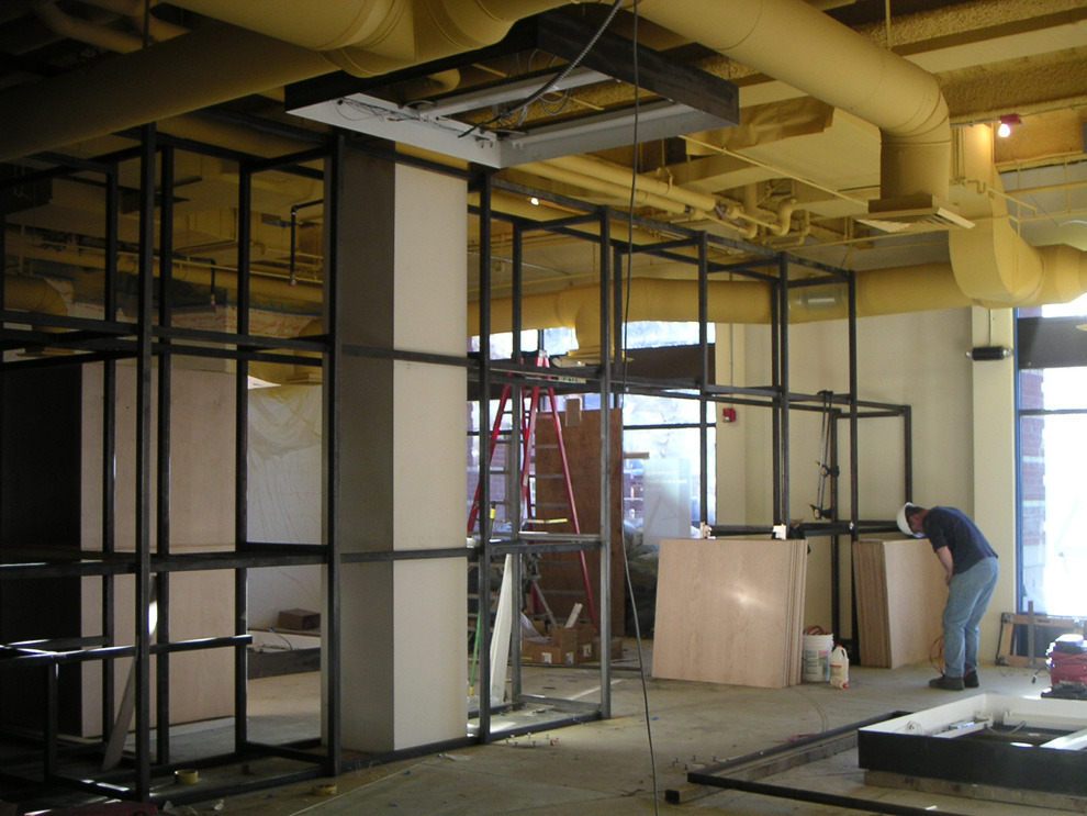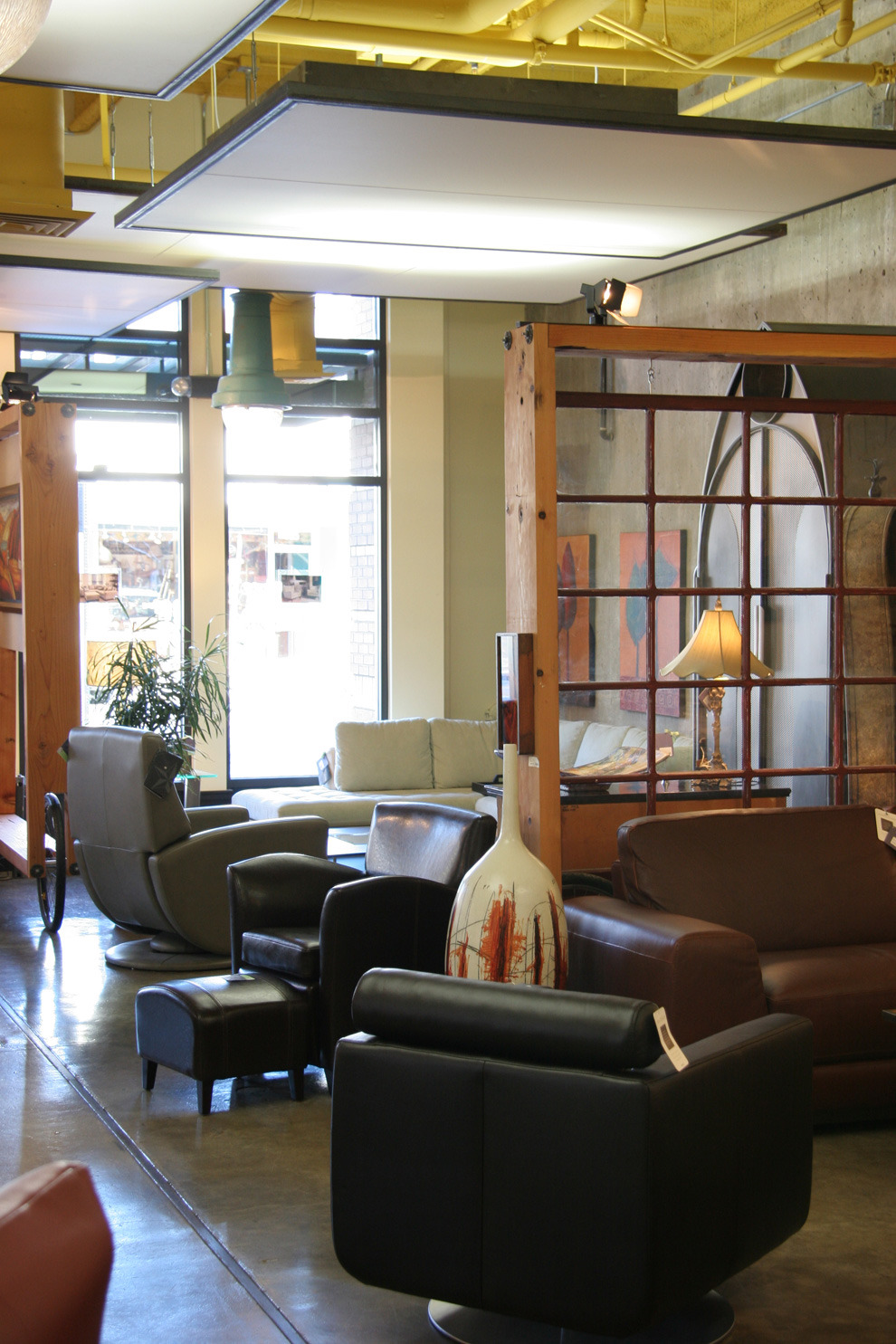 As the client describes it, 'atmosphere' is the idea and act of 'rising'. Vignettes are created for this boutique of fine furnishings and goods. Like a stage setting, the space has movable walls and a cloud-like variable lighting system. It adapts to changes in merchandise and daily/ seasonal changes of outdoor light. Stained concrete floor with circular wood inlay pattern guides pedestrians.