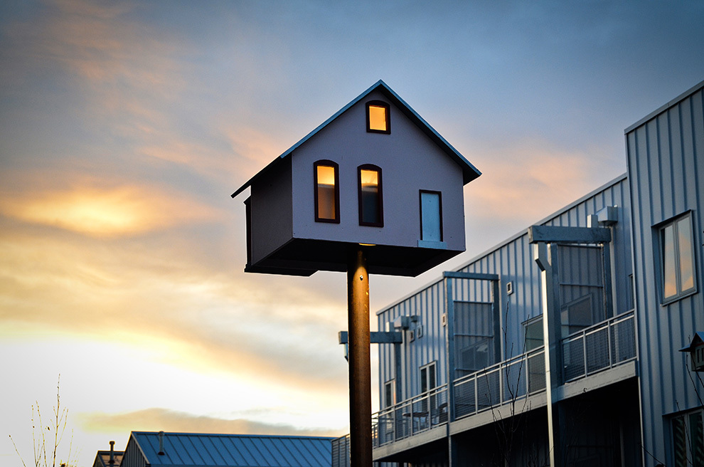 In reverence for the historic Curtis Park neighborhood, five bird houses were designed and built as exact replicas of classic homes constructed from the 1880s to the 1930s in the Italianate and Queen Anne styles. Their paint and decor match the local classics, a nod to the historic neighborhood they now sit in.