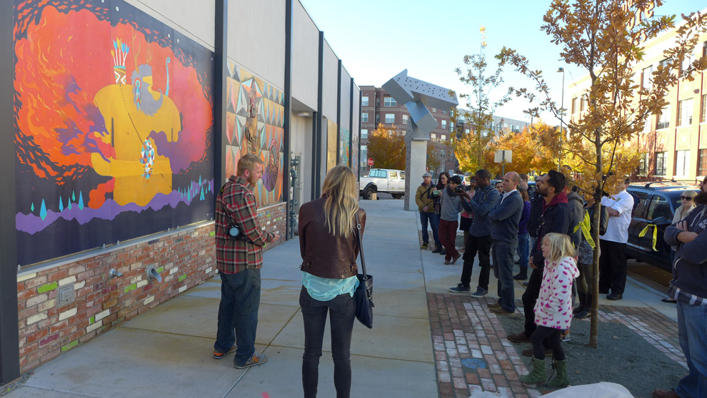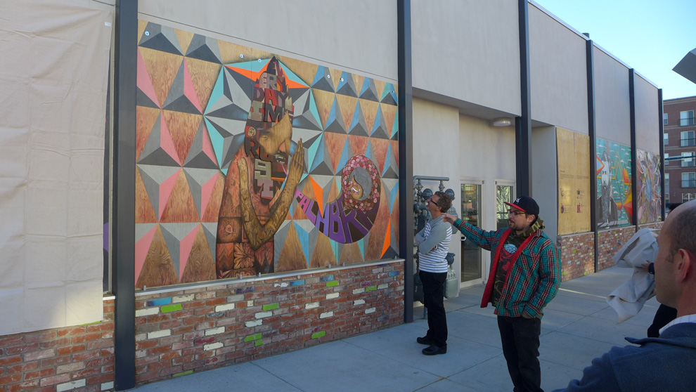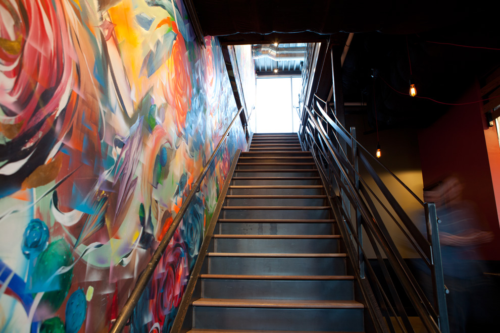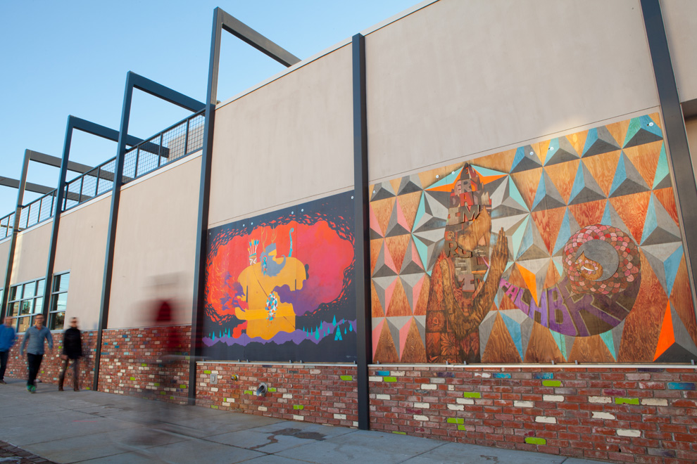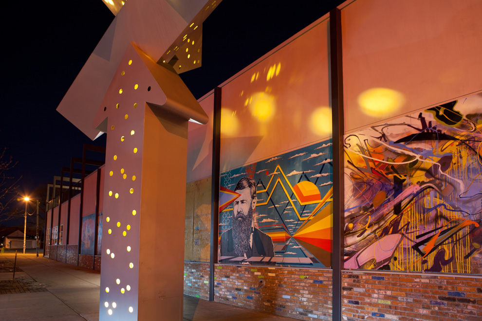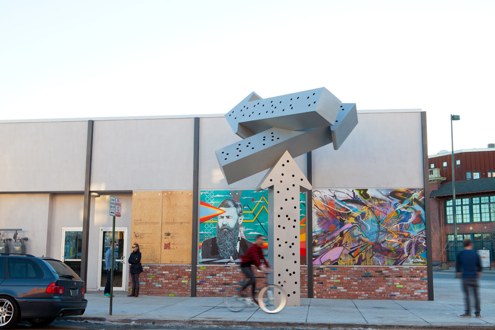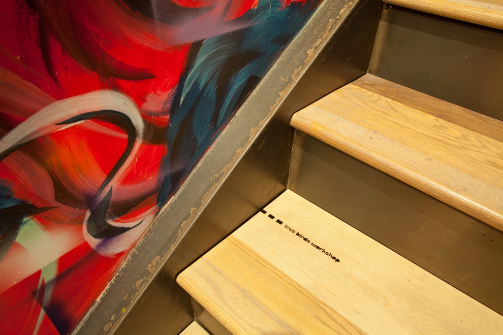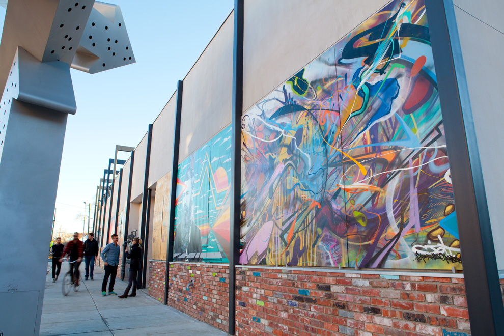 Here, architecture was applied intentionally to produce new opportunities for local and visiting artists. tres birds workshop recognized the opportunity to integrate the building site into the existing art scape. Taking an experimental approach, tres birds workshop envisioned an outdoor mural system that would perpetuate continual rotation of new artwork, give artists the opportunity to create high caliber work in studio, and then allow the artwork to live on and be collected afterward. The steel exterior mainframe creates partitions where the outdoor artwork is framed and exhibited, merging the experience of viewing street and gallery art into one. In this system, artists are given a platform not for only creating, but for taking a larger stake and therefore, reward, in the sale if their artwork.