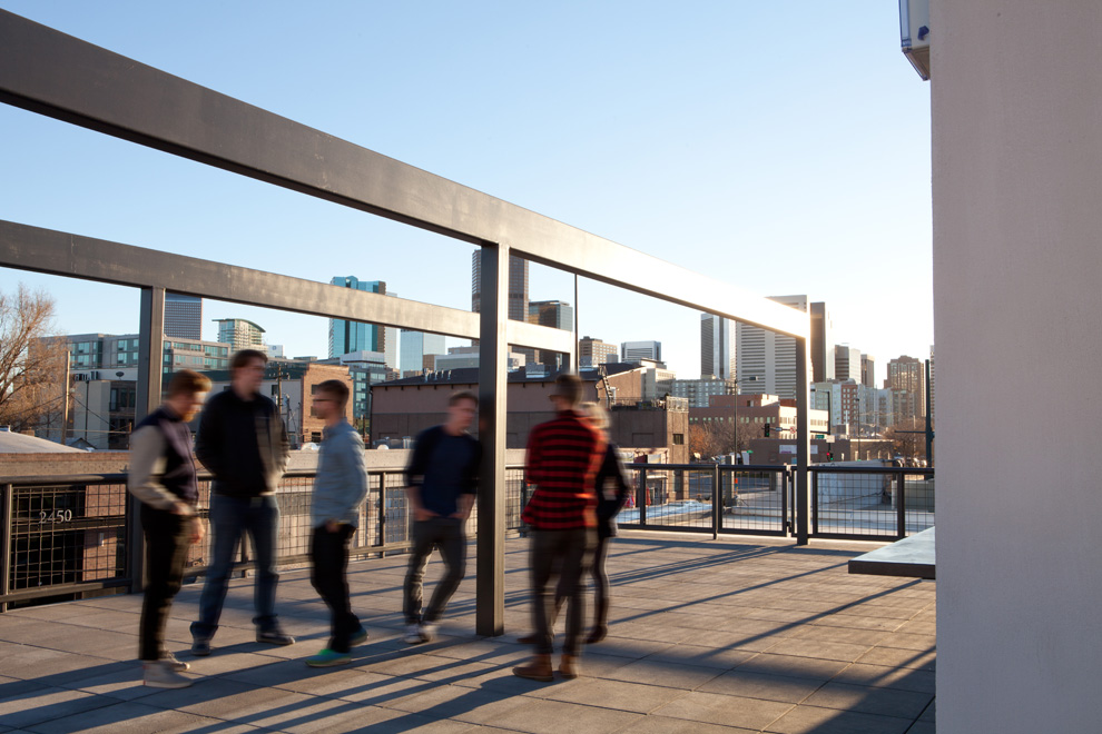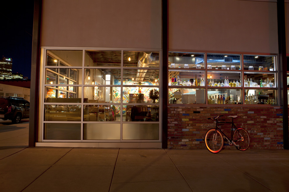 Along Larimer Street (southeast facing wall), large openings and a garage door/ wall system were created for year round connection to the outside. Aspect tuned glazing moderates the solar heat gain on each side of the building while allowing for a 100% day-lit structure.