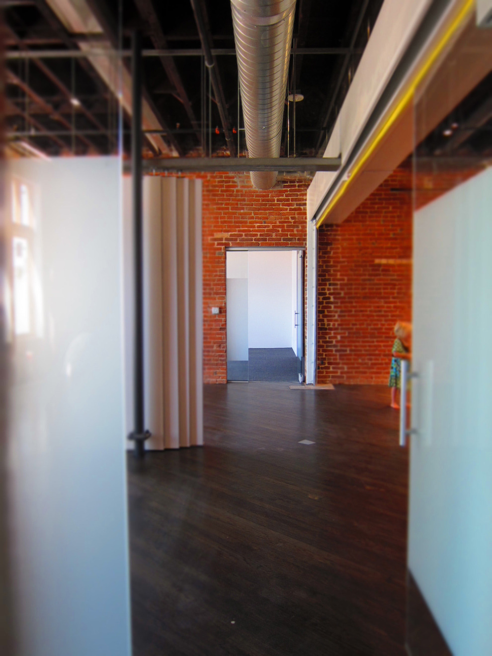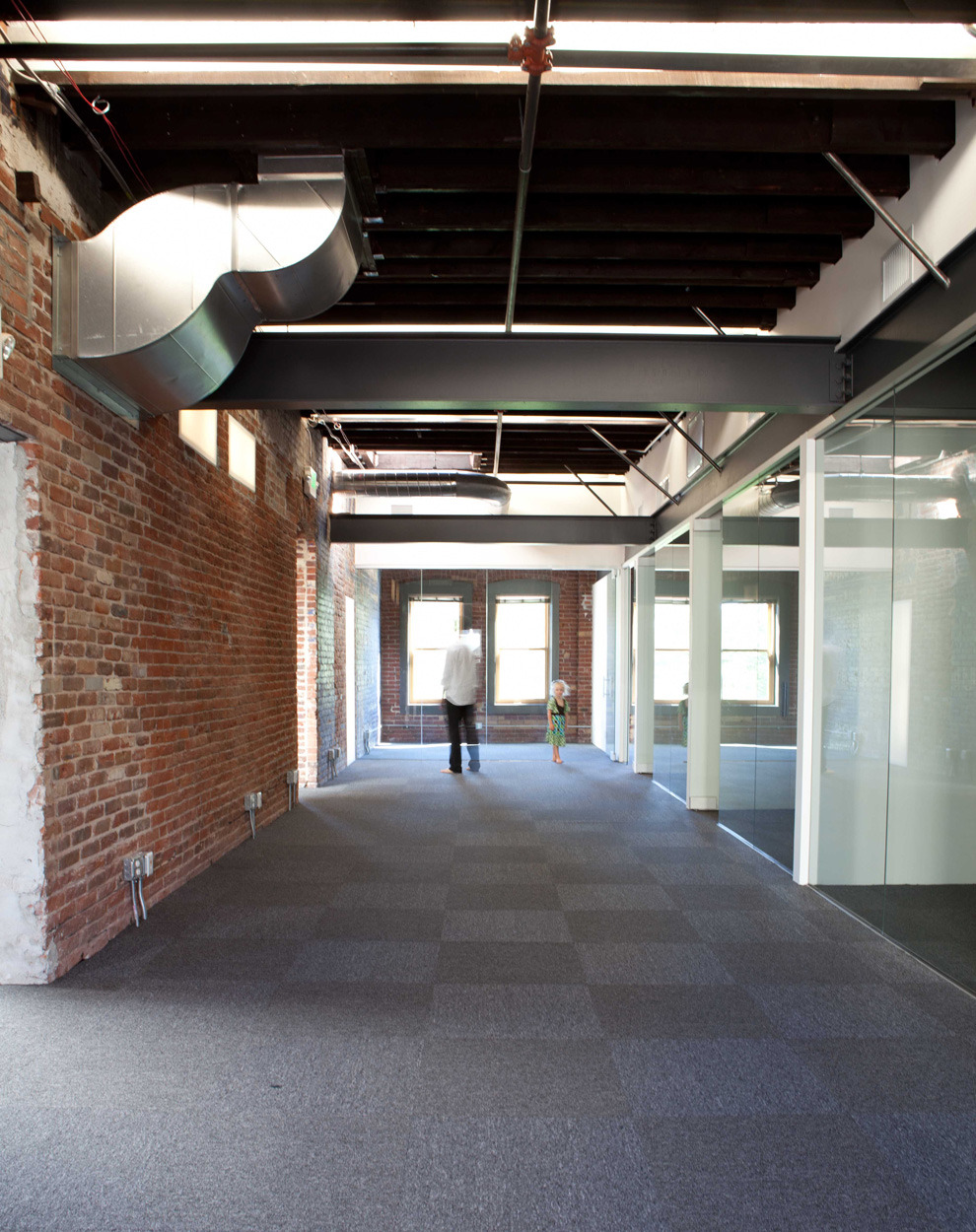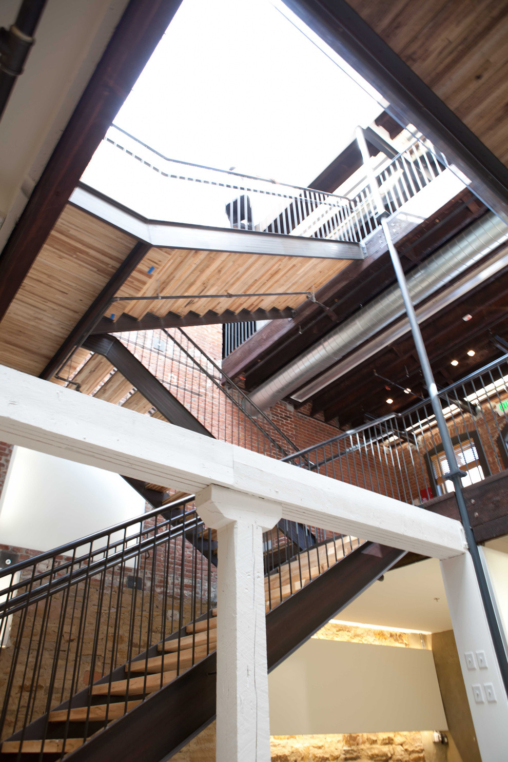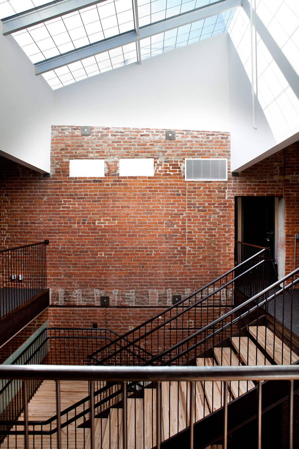 Addressing the first priority of light and openness, the building was stripped down to its component pieces of brick, wood and steel. Introduced materials were limited to steel, glass, and reclaimed maple wood. Through the creation of a large central atrium, made of maple floors from old railroad boxcars, sunlight now reaches all occupants and floor levels, including the rubble basement, previously regarded as a dungeonous area to be avoided. Now it is home to a day lit kitchen and place for project-based meeting rooms. Incorporating the building into the history of it’s neighborhood and giving a nod to the historic building itself, the exterior was fit with armature made from old railroad tracks, which will become heavily vegetated over time. Not only does this add a pleasing natural aesthetic, the vegetation will further contribute to sun shading and the energy efficiency of the building. In this system, the main source of temperature control is via the roof, which is heavily insulated to adapt to heat and cold conditions, providing optimal comfort to building inhabitants. Throughout the building, all systems were modified into what is now a highly efficient, well-lit incubator for some of Denver's finest creative professionals.