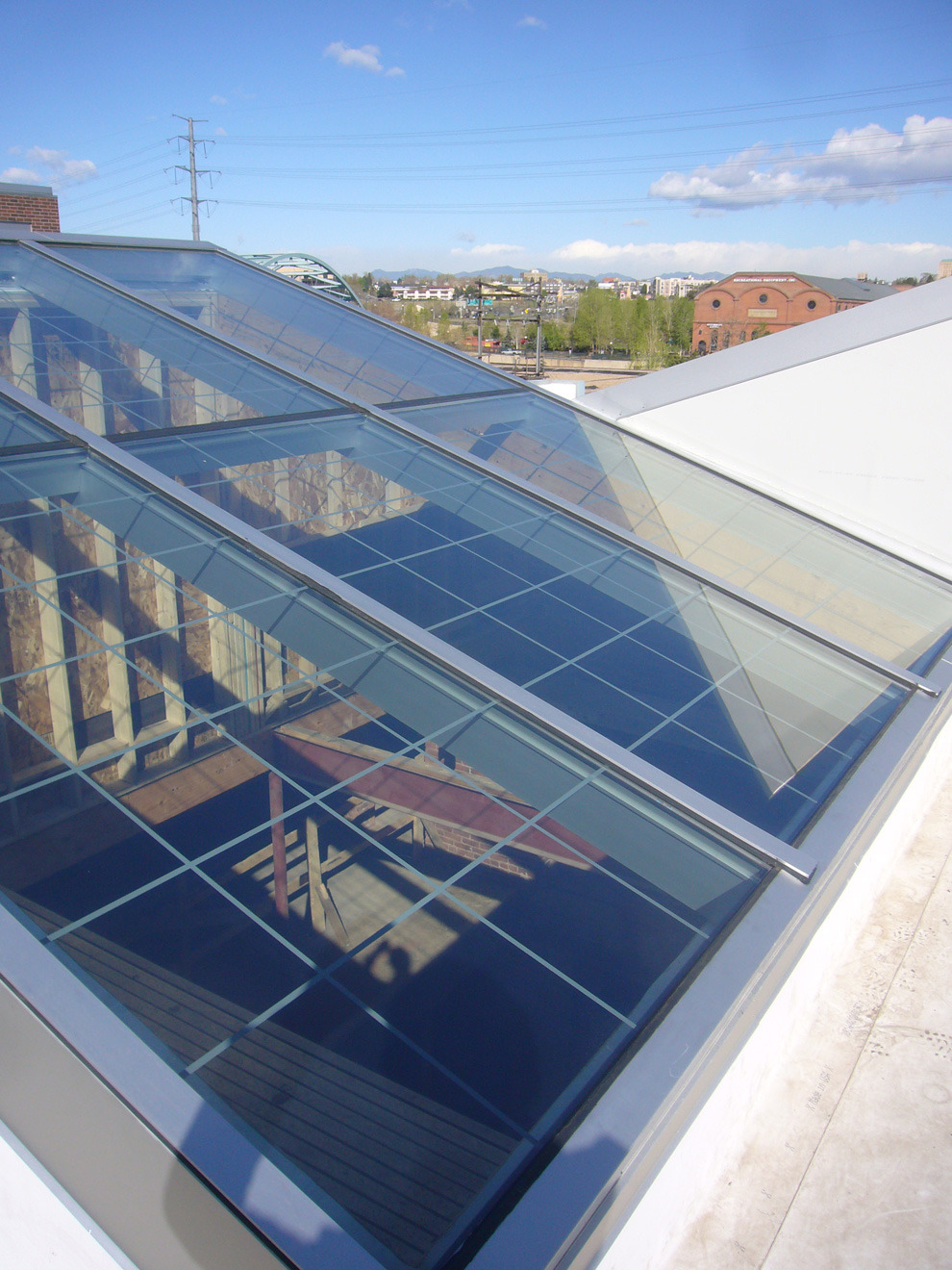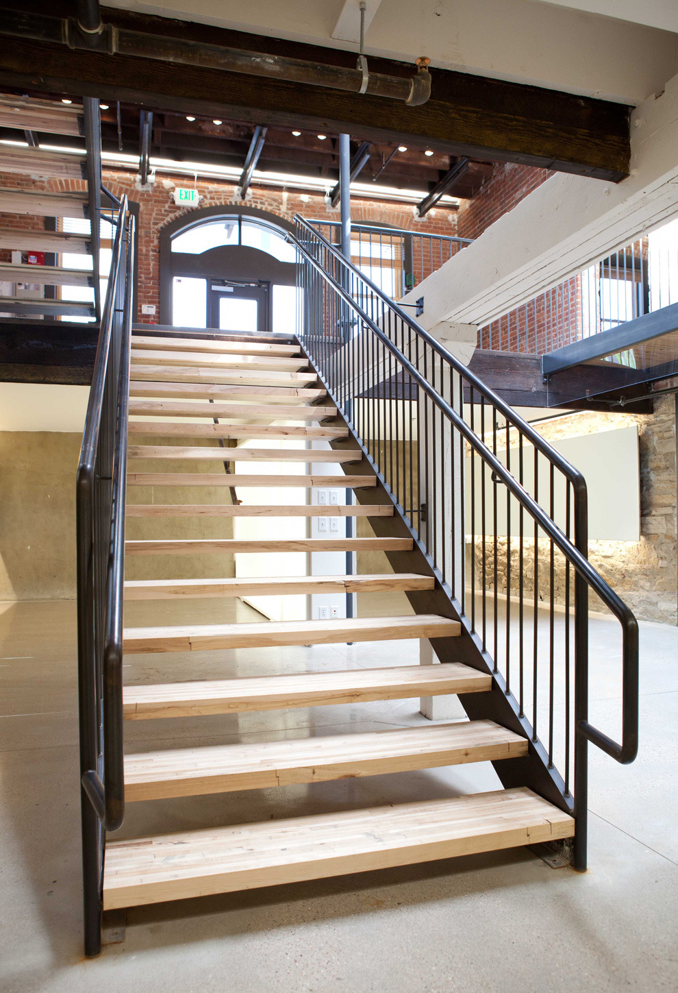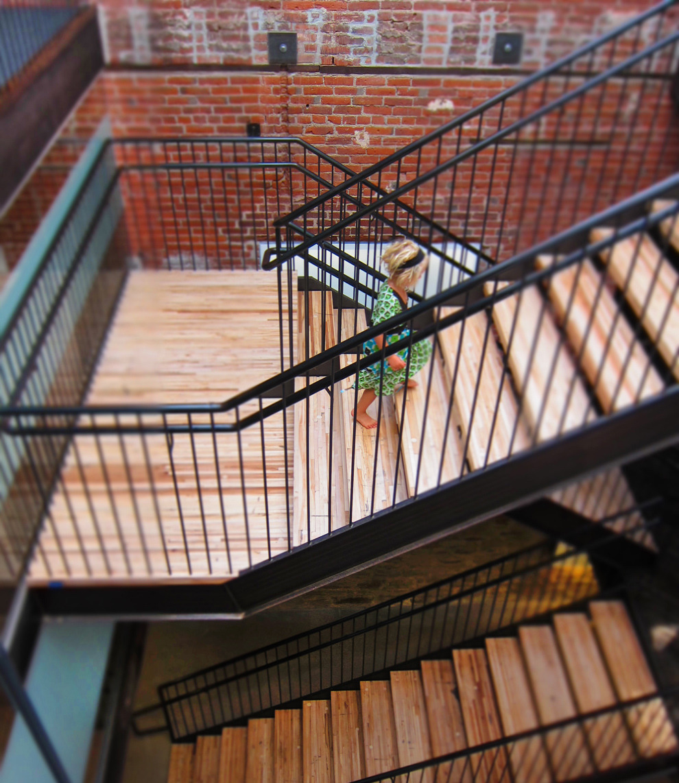 Addressing the first priority of light and openness, the building was stripped down to its component pieces of brick, wood and steel. Introduced materials were limited to steel, glass, and reclaimed maple wood. Through the creation of a large central atrium, made of maple floors from old railroad boxcars, sunlight now reaches all occupants and floor levels, including the rubble basement, previously regarded as a dungeonous area to be avoided. Now it is home to a day lit kitchen and place for project-based meeting rooms. Incorporating the building into the history of it’s neighborhood and giving a nod to the historic building itself, the exterior was fit with armature made from old railroad tracks, which will become heavily vegetated over time. Not only does this add a pleasing natural aesthetic, the vegetation will further contribute to sun shading and the energy efficiency of the building. In this system, the main source of temperature control is via the roof, which is heavily insulated to adapt to heat and cold conditions, providing optimal comfort to building inhabitants. Throughout the building, all systems were modified into what is now a highly efficient, well-lit incubator for some of Denver's finest creative professionals.