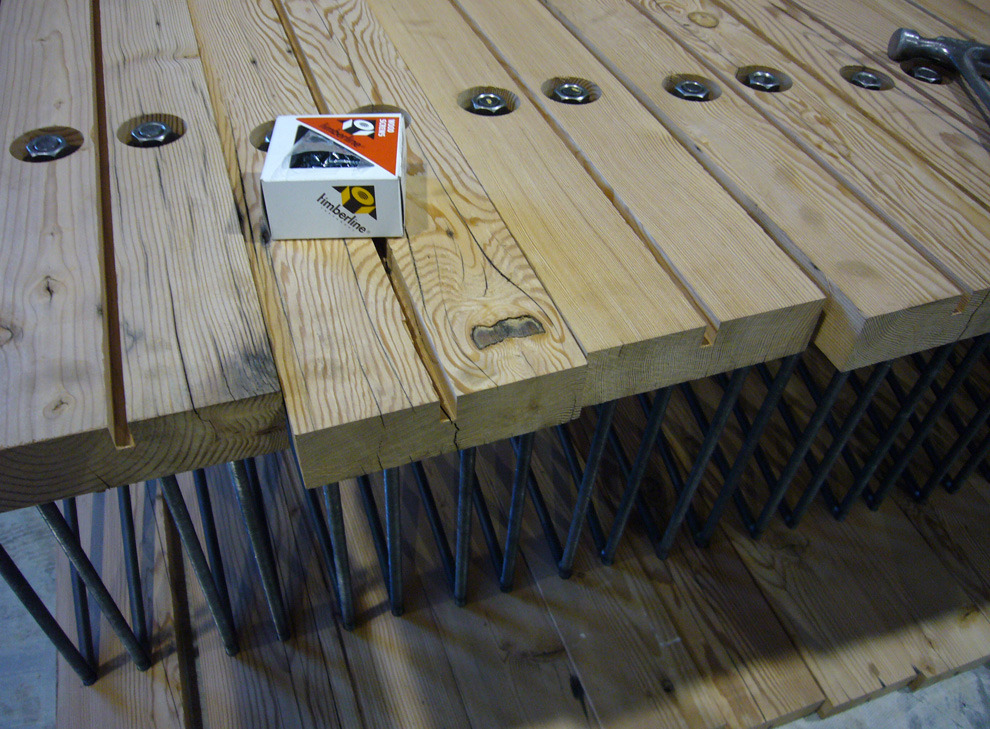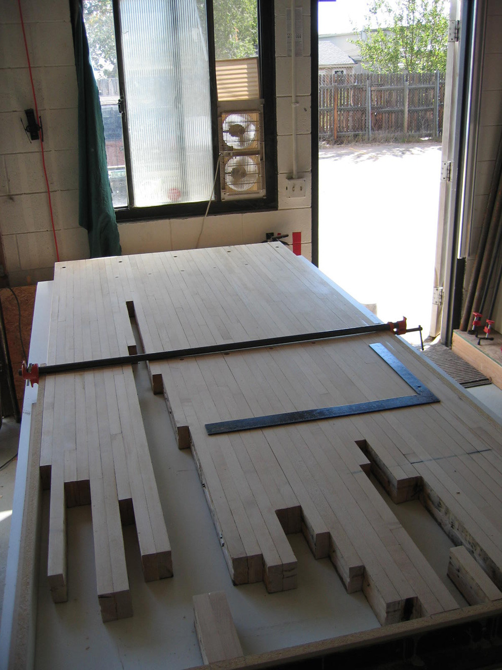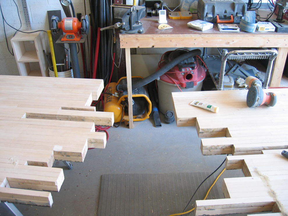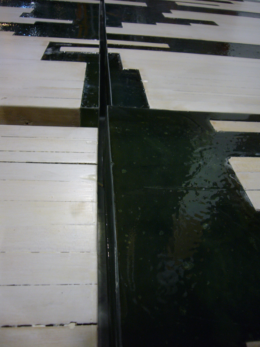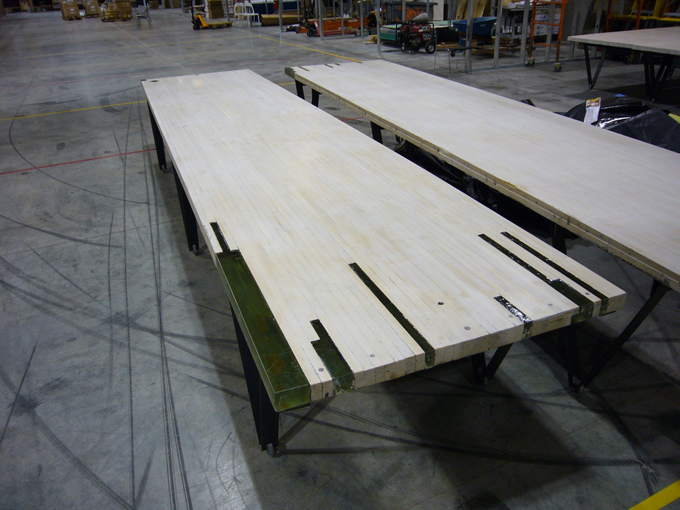 GLOW TABLES are butcher block bowling lanes in which sections are eliminated and the voids poured-in with grass green colored resin that glow with light.