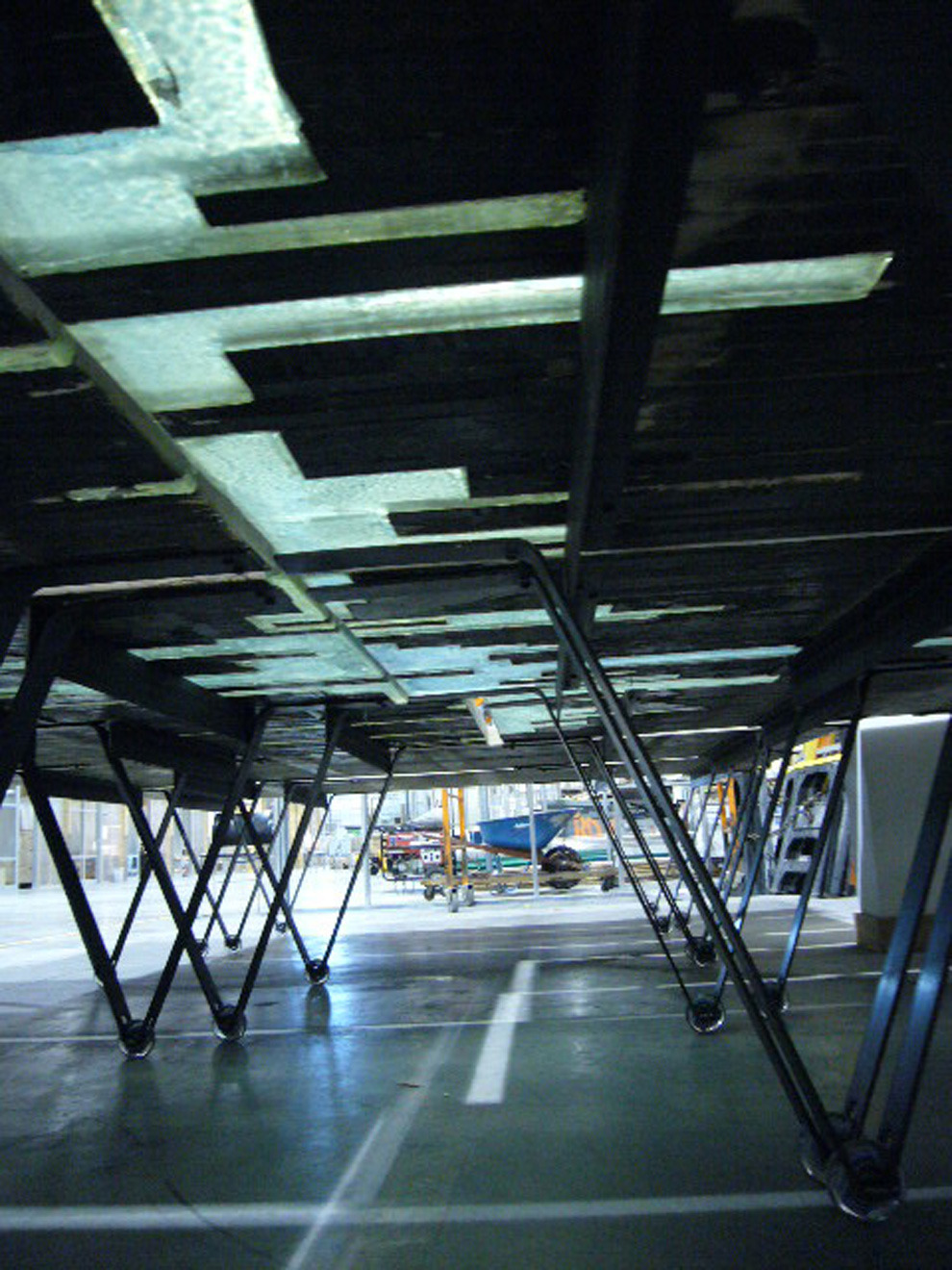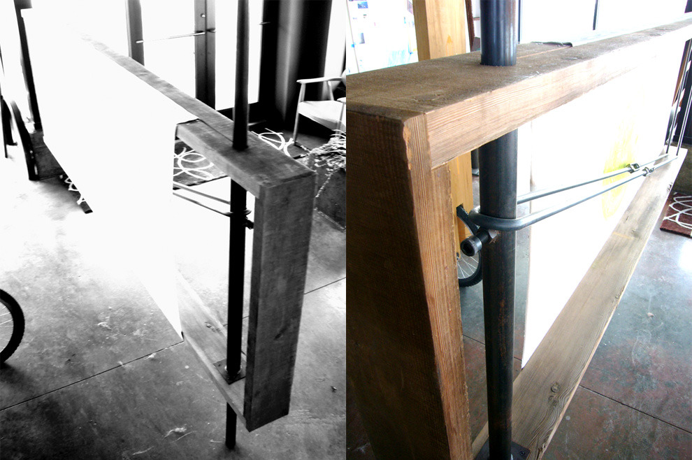 FLAGS designed for the ‘factory’ act as adjustable screens, dividing work spaces and occupying free air space. Steel flagpoles connect from ground to roof, timber frames cantilever off pole, billboard vinyl or canvas are stretched in frames. Messages can change.