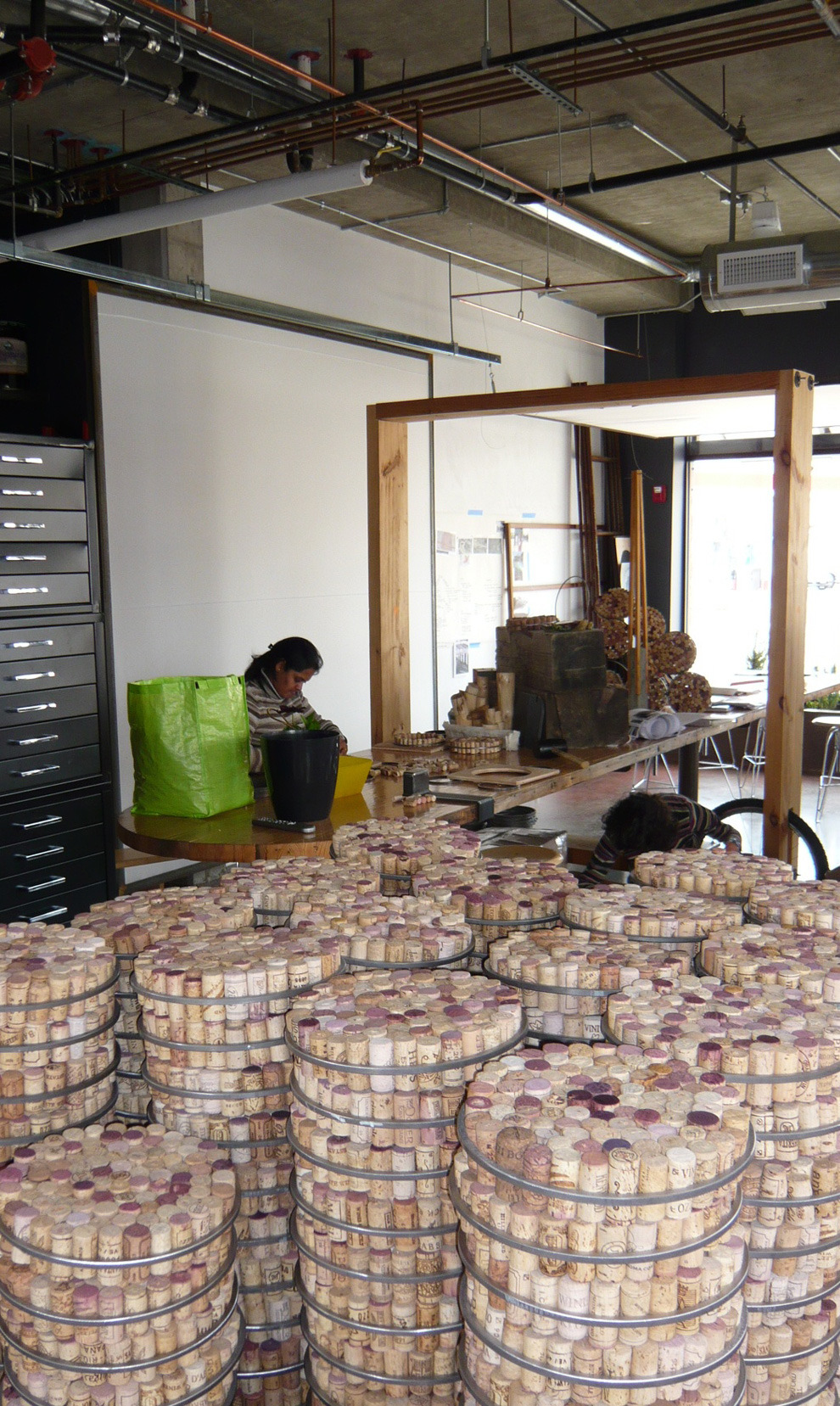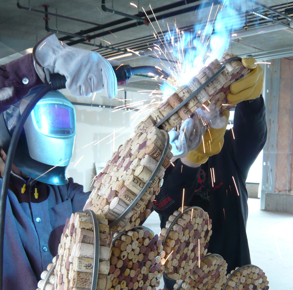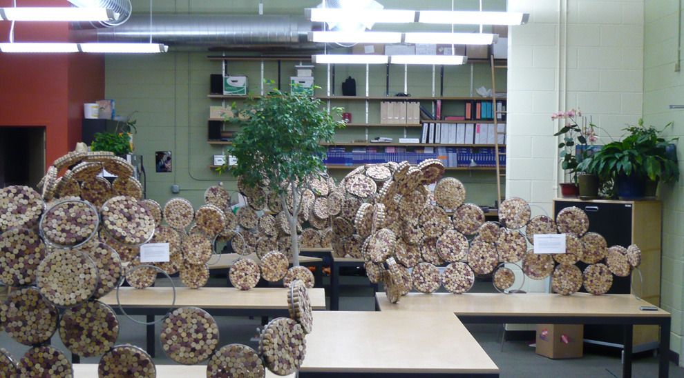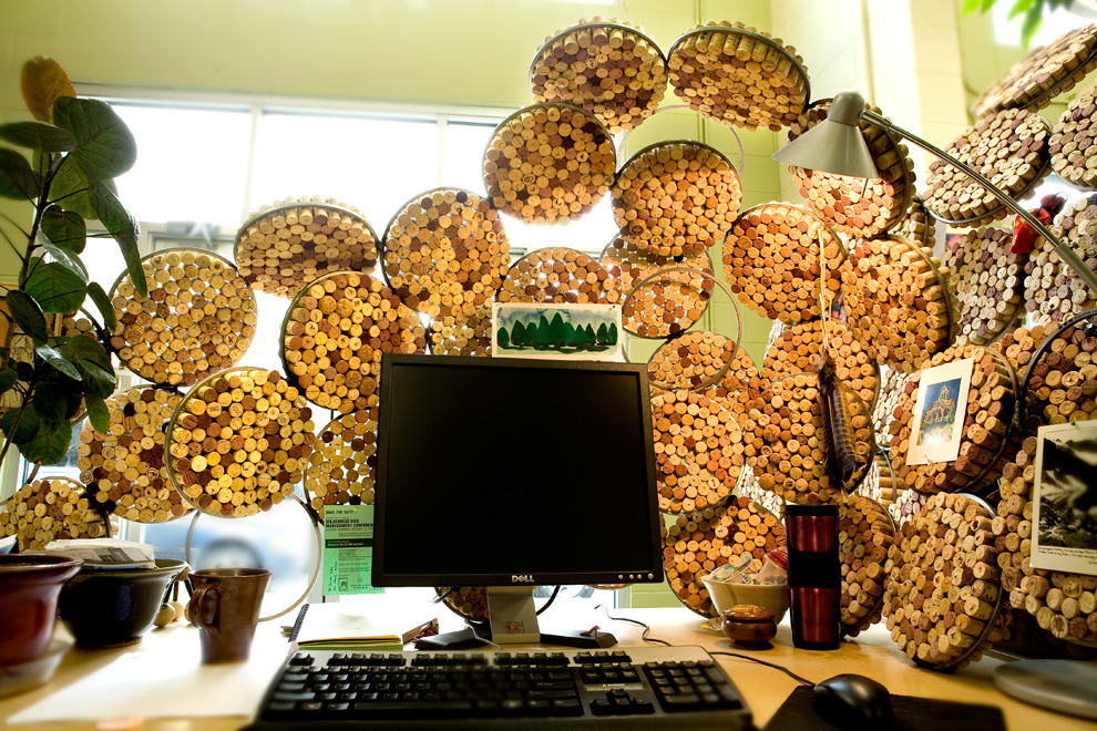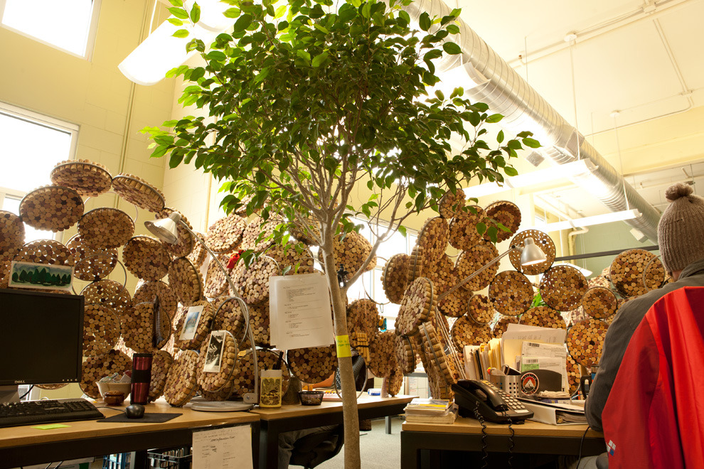 The challenge: an open floor plan, demanding some level of sound mitigation. After researching sound attenuation, the decision is made to go cellular. The process begins by stuffing tens of thousands of reclaimed corks into steel rings. Organic dividers are sculpted to break up sound, provide privacy, and create pin-up spaces.