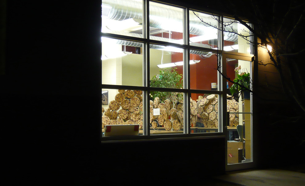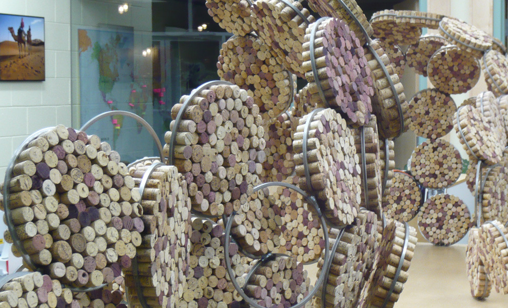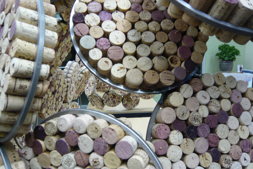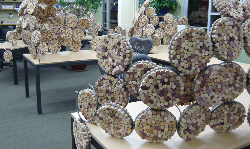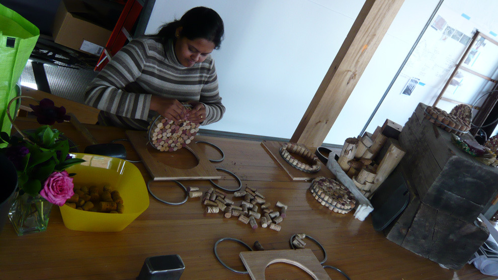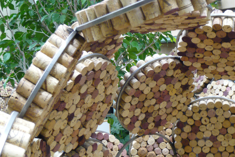 The challenge: an open floor plan, demanding some level of sound mitigation. After researching sound attenuation, the decision is made to go cellular. The process begins by stuffing tens of thousands of reclaimed corks into steel rings. Organic dividers are sculpted to break up sound, provide privacy, and create pin-up spaces.