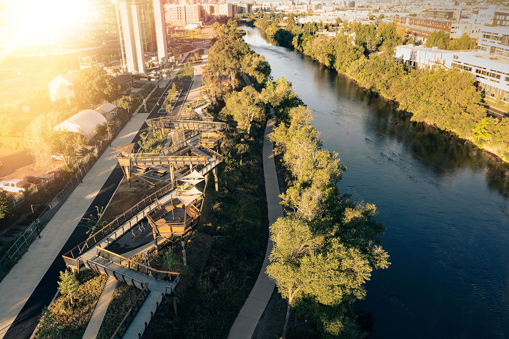 As part of the City of Denver’s Game Plan for a Healthy City, Tres Birds, in collaboration with Wenk Associates, has taken on the reprogramming and design of a multi-block stretch of the south Platte river front property between 32nd and 38th streets, dubbed Arkins Promenade. The center of this stretch is anchored by RiNo ArtPark, a Tres Birds reclamation project completed in 2021. North of the Art Park is home to the Elevated Walkway. Designed by Tres Birds, the walkway is a 400-foot-long elevated platform adjacent to the South Platte River, offering views up and down the river corridor and of the surrounding neighborhoods and city beyond.