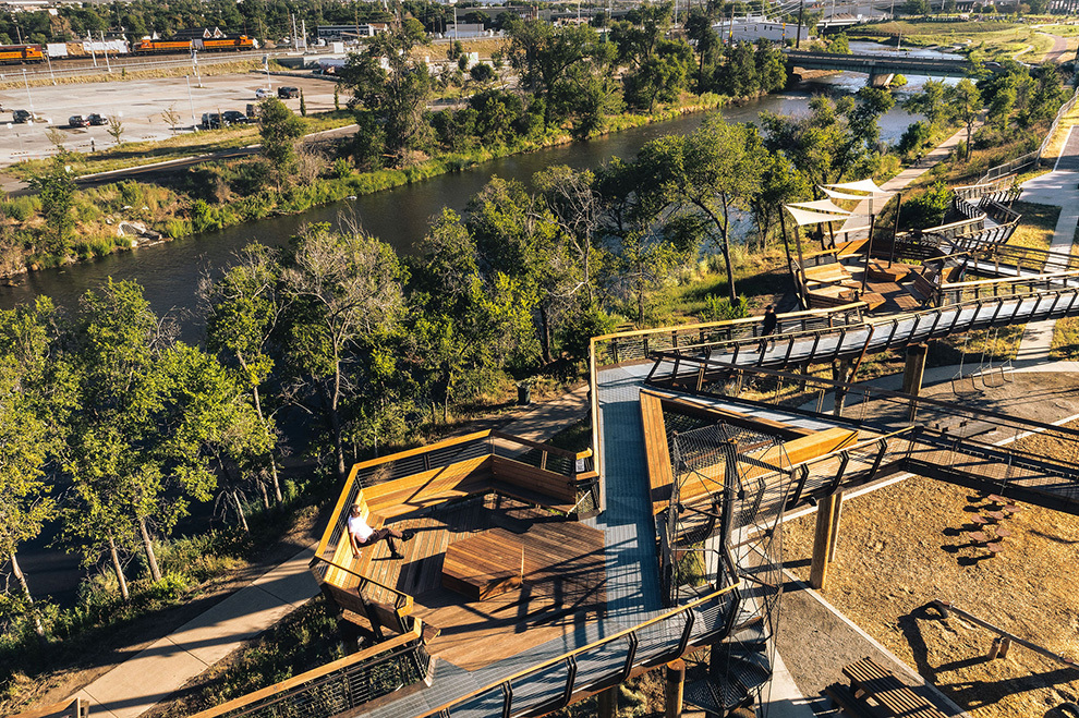 Designed to reconnect the community to the river corridor after years of industrial activity, the elevated walkway and surrounding park connect the Platte River bike and pedestrian trail to the neighborhood through green, public space, offering opportunities for playing, gathering, strolling, and sitting.
