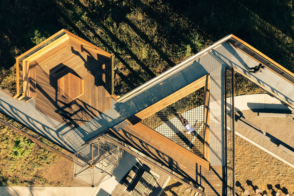 The steel walkway is supported by telephone poles and climbs to a height of 28 feet at its highest point, where it opens to an expansive deck overlooking the river. The wood plank decking, railings and picnic tables are crafted from sustainably sourced lumber that will weather to grey. A spider-web of sturdy netting built into the deck encourages climbing across and lounging above the park. Recycled plastic milk bottles formed into grey blocks have been constructed into benches at the ground plane.
