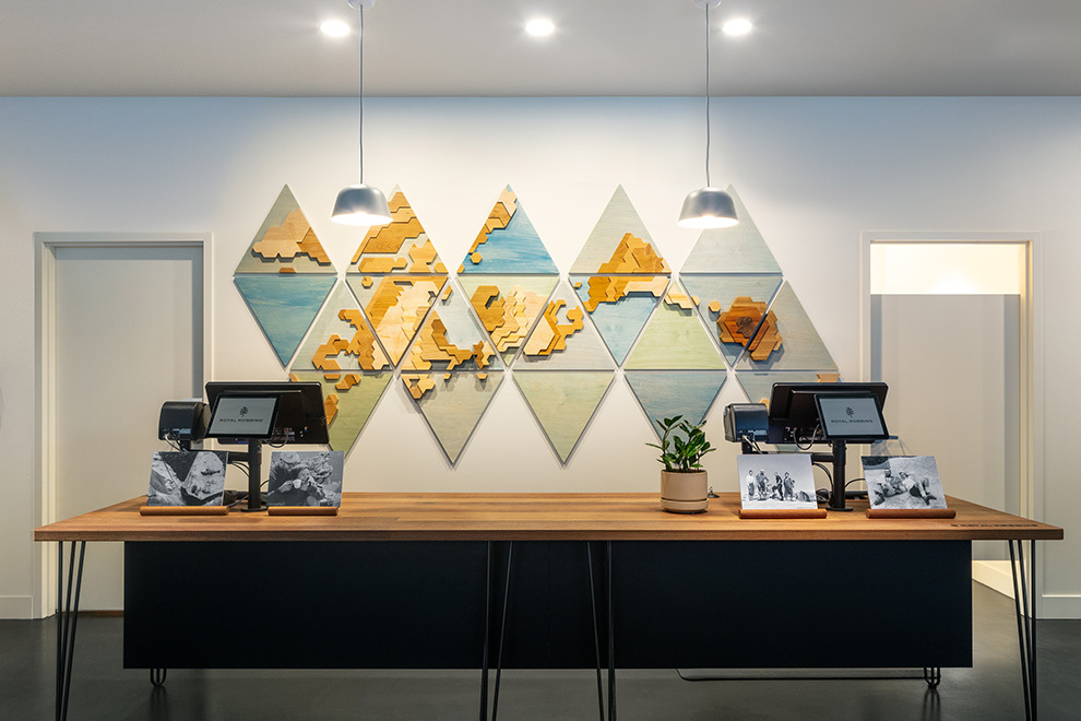 The Royal Robbins brand celebrates a rich heritage in the climbing world, and a hopeful future in adventure travel. The Denver space is the first flagship brick and mortar store for the company and captures the uniqueness of the brand story and its commitment to improving sustainability in outdoor clothing while inspiring travel domestic and abroad. Through materiality, imagery, and furnishings, the design embraces the themes of global travel, sustainable materiality, and nods to the climbing heritage of the brand.