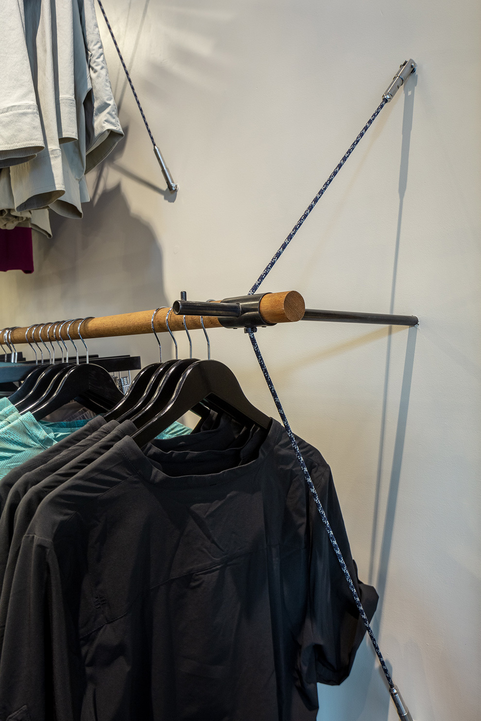 The Fjällräven space is heavily day-lit, with displays hanging on beetle-kill-pine posts, rather than solid walls, allowing the daylight to spill into the store through the displays, as it would in a forest. Front Range beetle-kill pine ceiling and Colorado Black Granite rocks create a local backdrop for the Swedish-inspired ash furnishings and the brand’s colorful clothing and gear. The “tailor hut” sits in the center of the space, highlighting the brand’s commitment to repair and personalized fitting services. Also built with beetle-kill pine, the tailor hut resembles the proportions of a simple Swedish cabin.