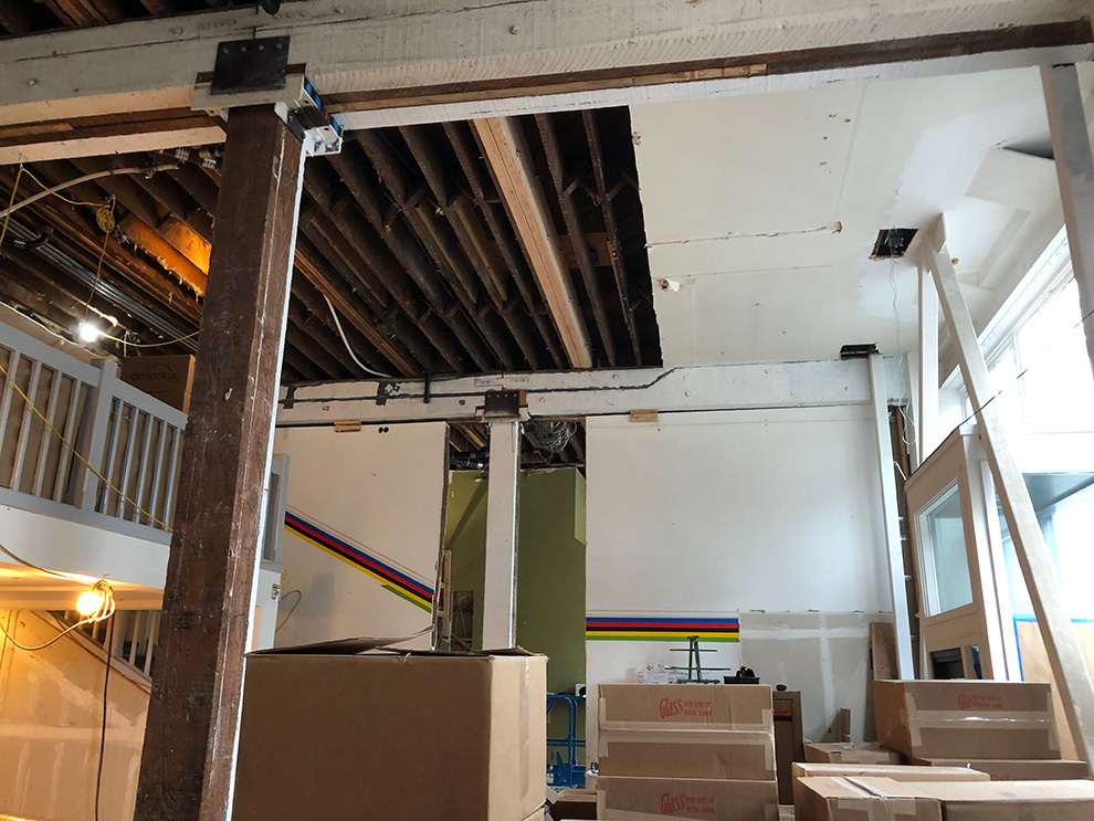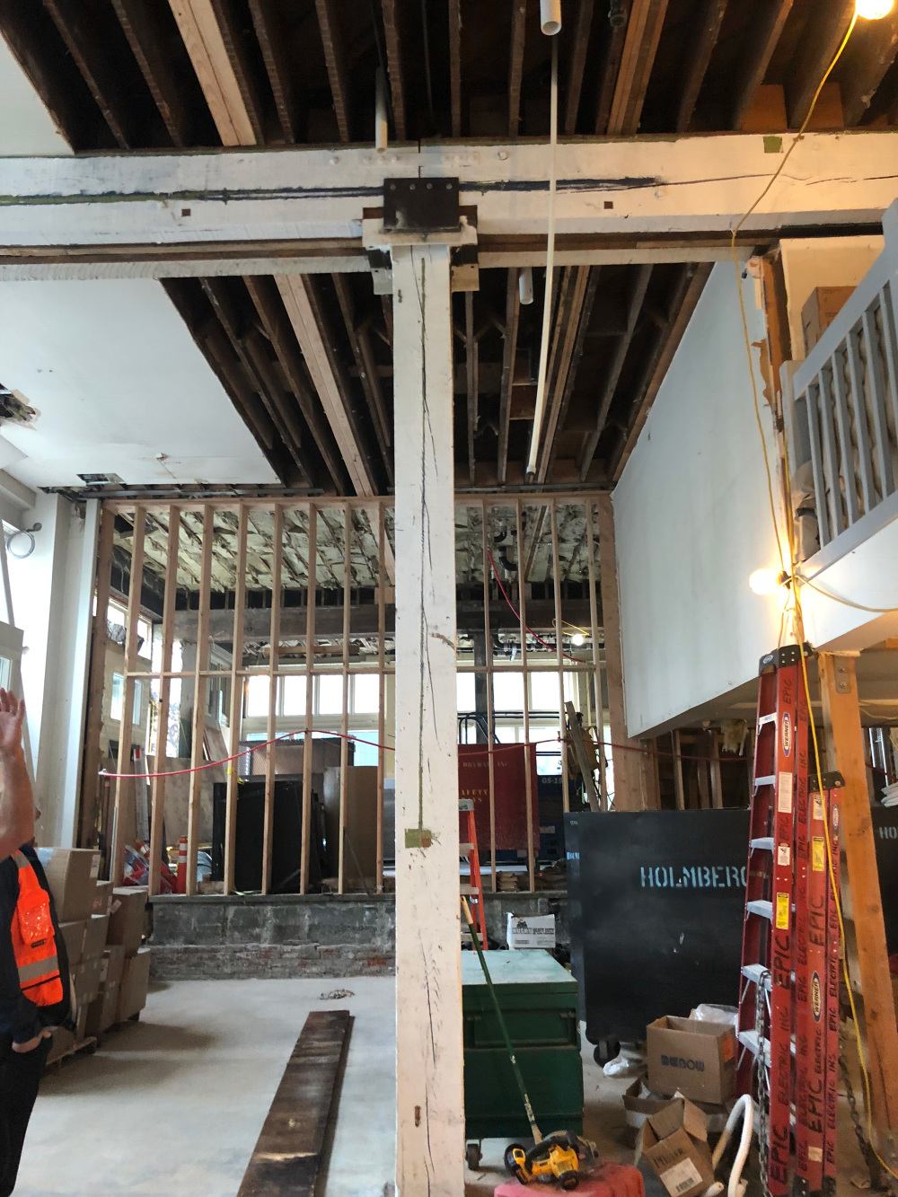 The new flagship merges Swedish design inspired by the Fjällräven brand heritage with the existing Doug Fir heavy timber structure and existing steel A-frames, added to the building for stability during seismic events. White ash wood, important to the brand and Swedish design, was used for custom displays and table surfaces throughout the store, including the tall ash wall at the center of the space, designed to resemble the axe-hewn logs of a traditional Swedish cabin.