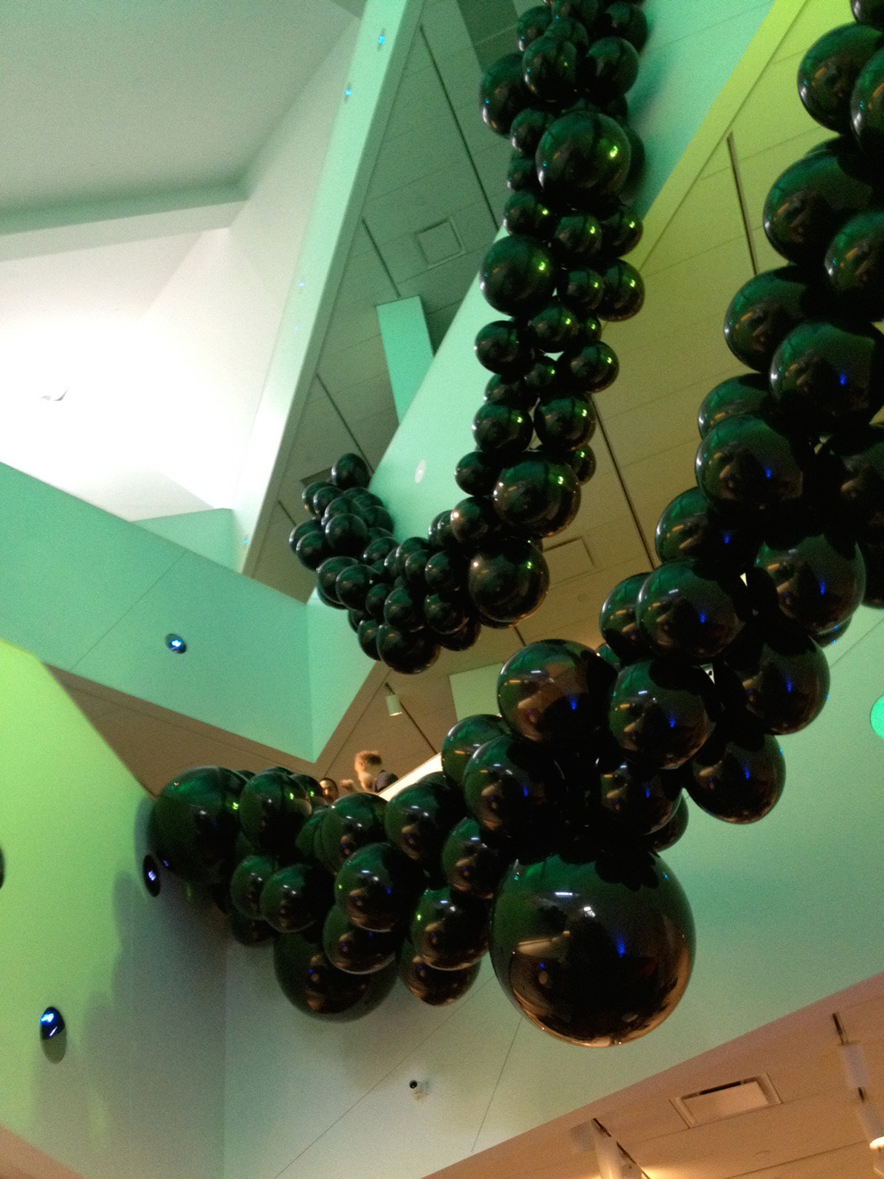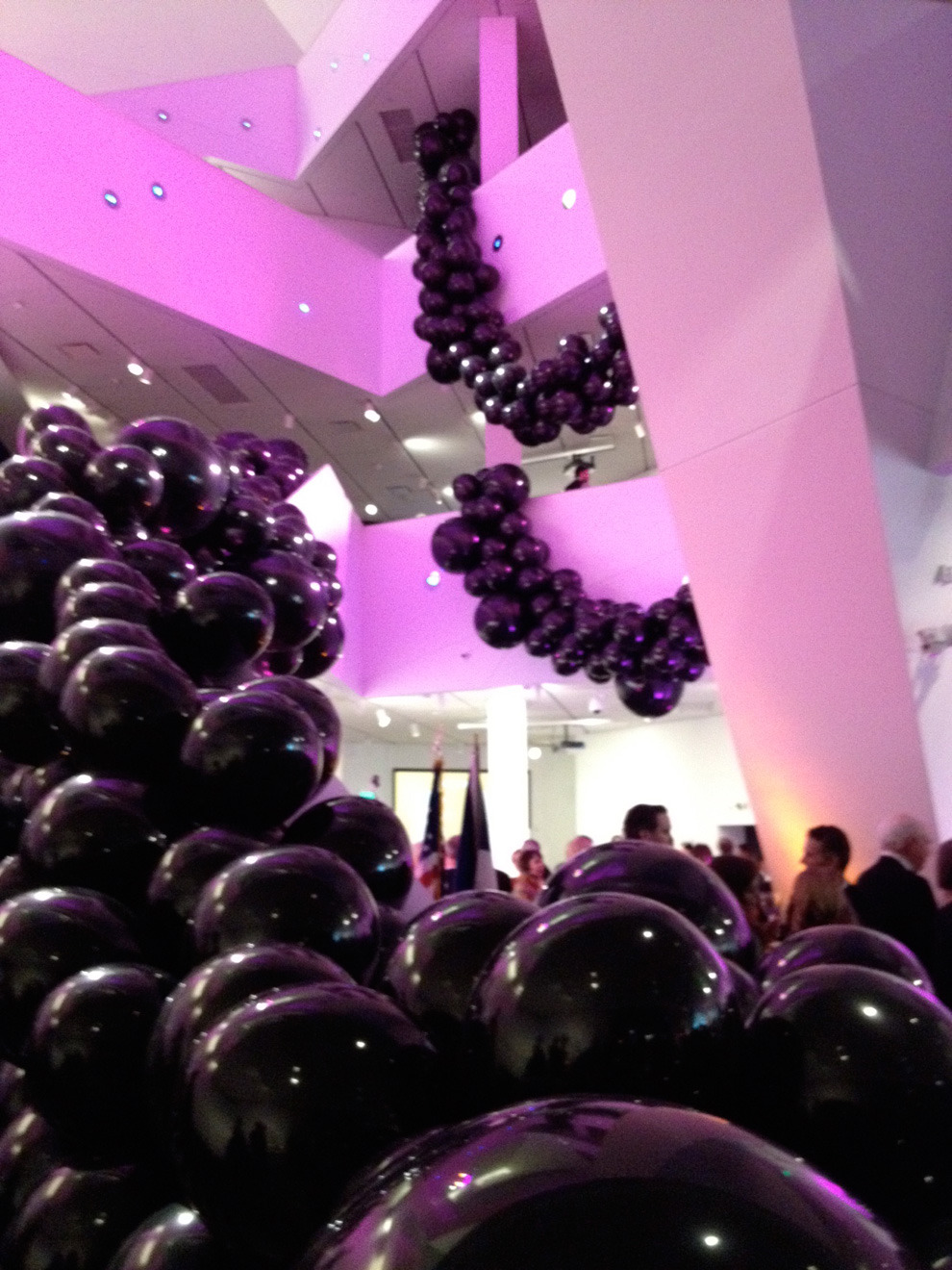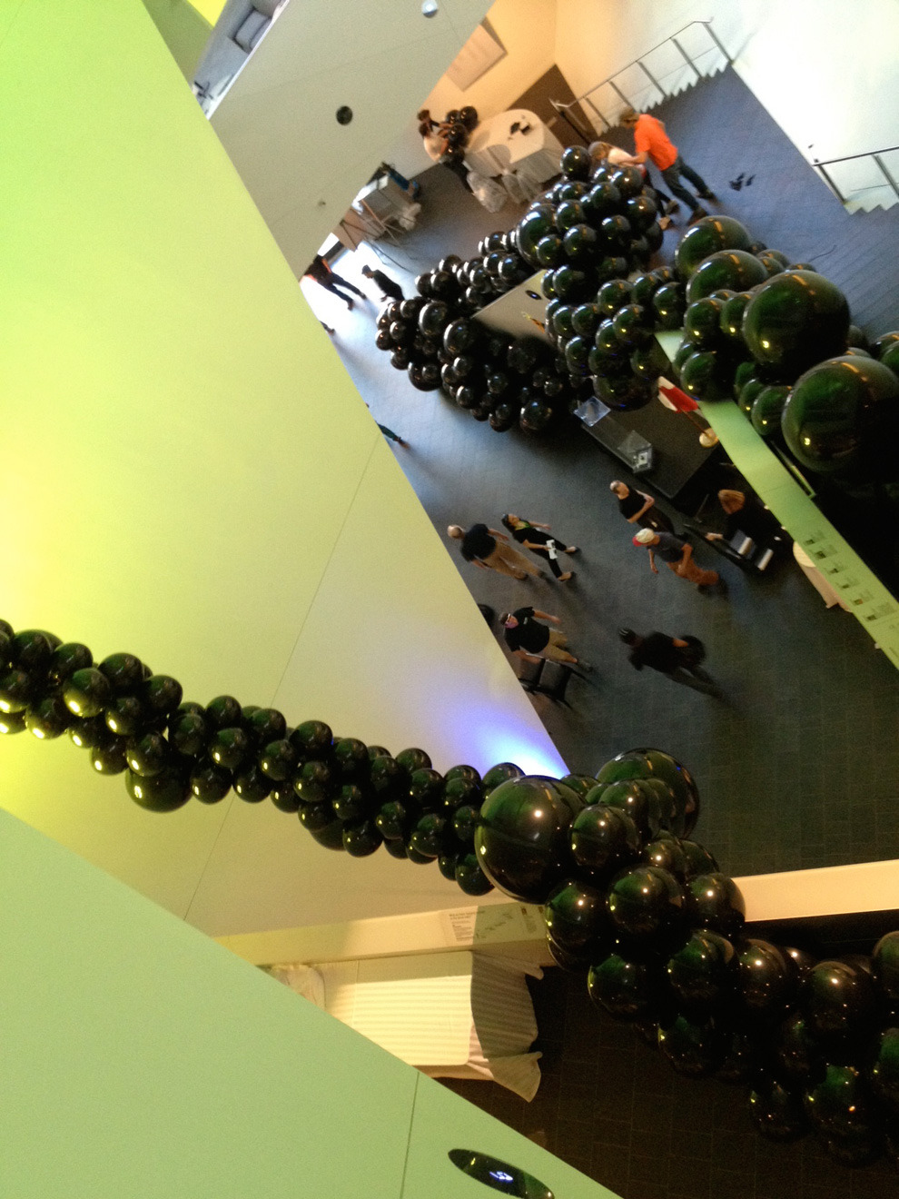 The tres birds workshop design team turned to balloons as the primary ingredient for dressing the evening in a ribbon of "Flowing Black Pearls." Approximately 1200 balloons were used. The pearl string was assembled in 7 hours. While tres birds workshop has no current plans to expand into the balloon medium, the installation represents a microcosm of our approach to larger architecture projects. Planning, modeling and execution must all be thought through thoroughly in order to meet the parameters of each project with success.