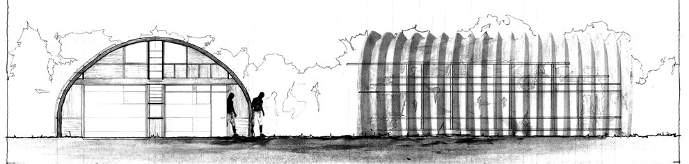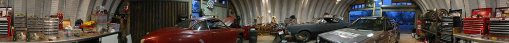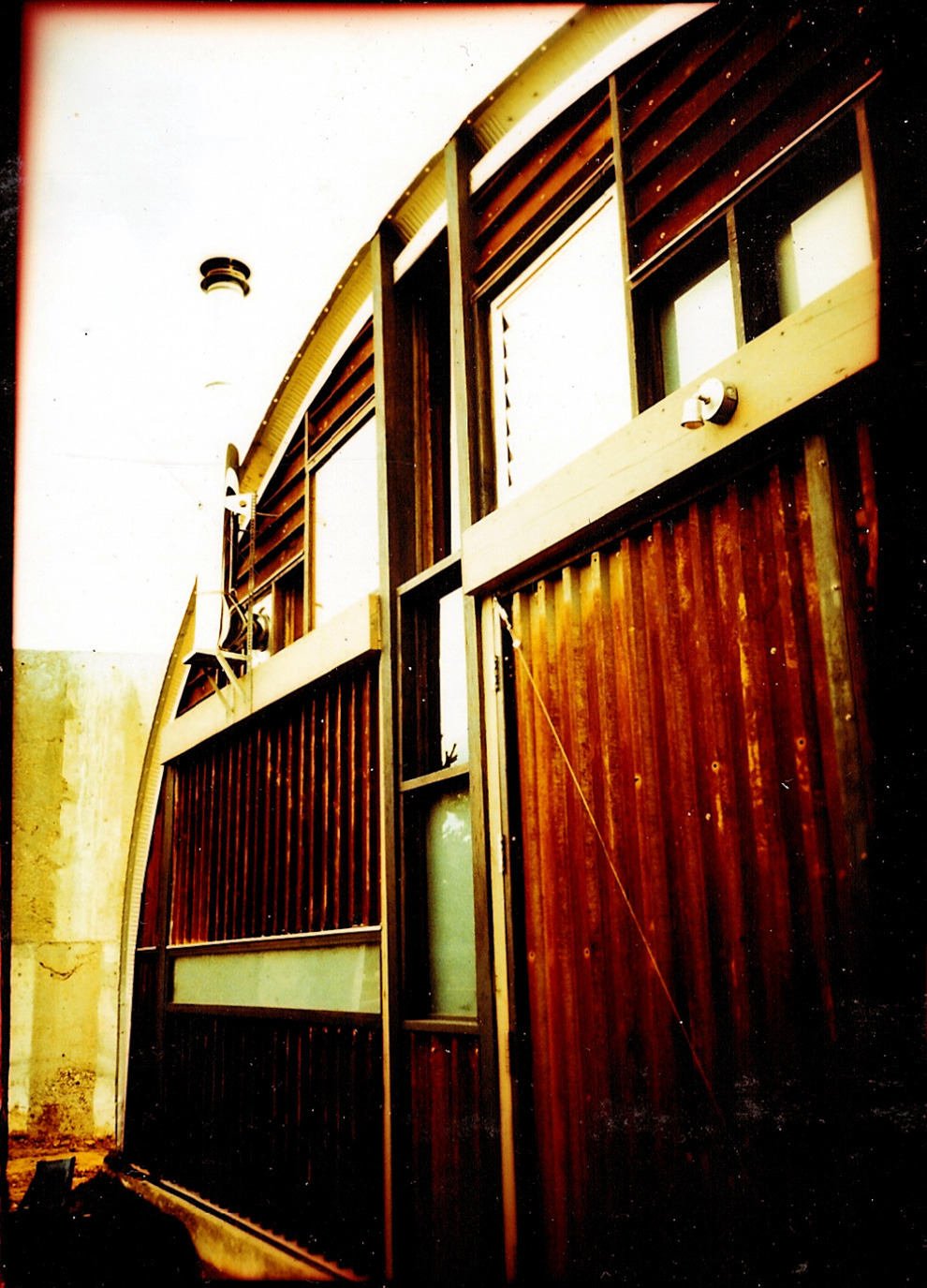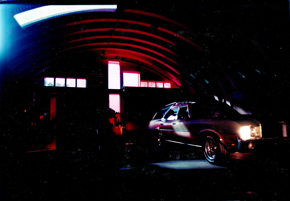 The client retreats to the Garage to work on his racing cars. As a professional photographer, he also uses the space as a staging area for his studio. For privacy, the garage closes down; views focused only on sky or trees at specified spots. The prefabricated shell is incised and inserted with fiberglass panels. End walls are framed with reclaimed lumber, steel, and colored glass. Small translucent areas of the north and south walls light up at night. The Garage serves its function without forgoing imagination.