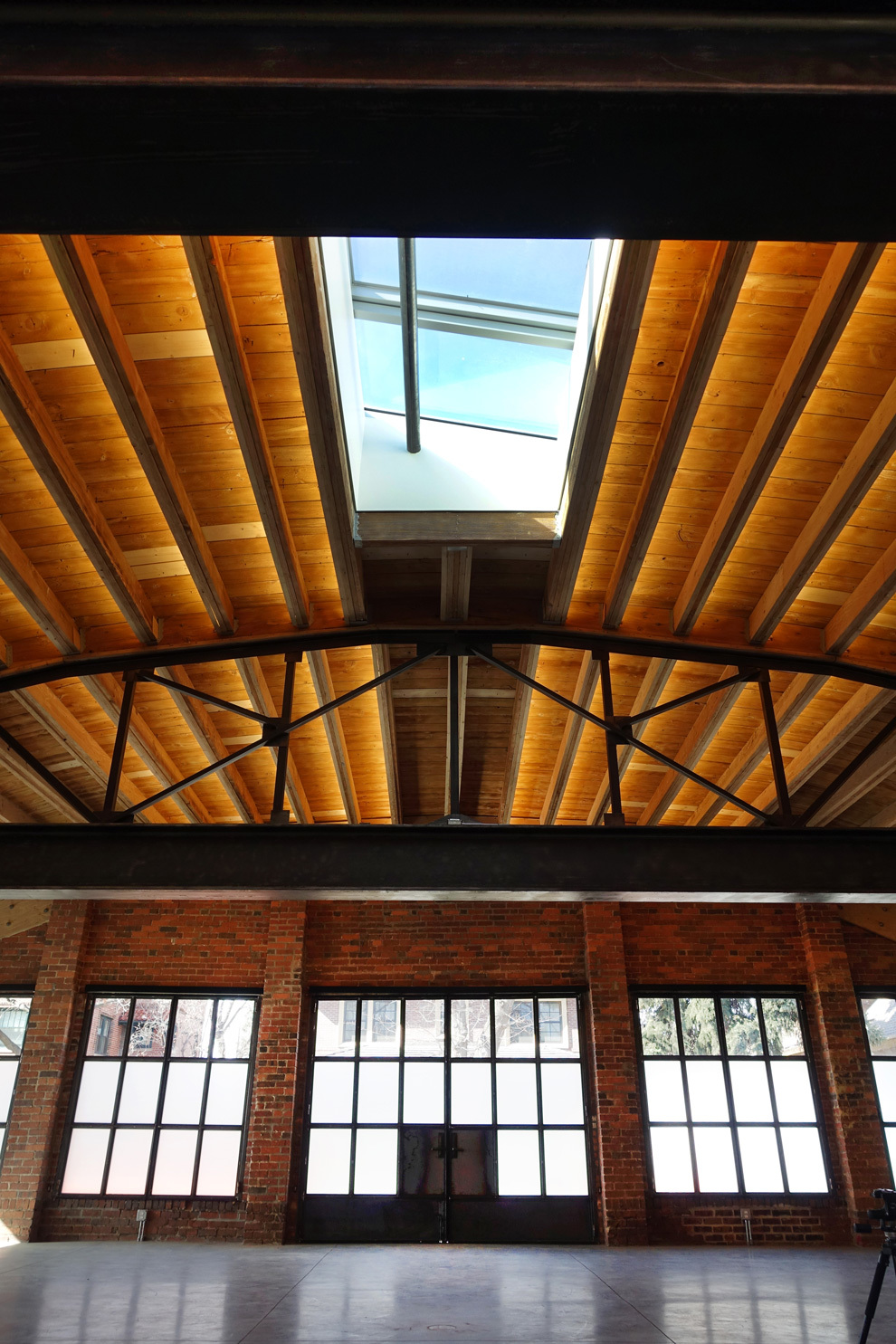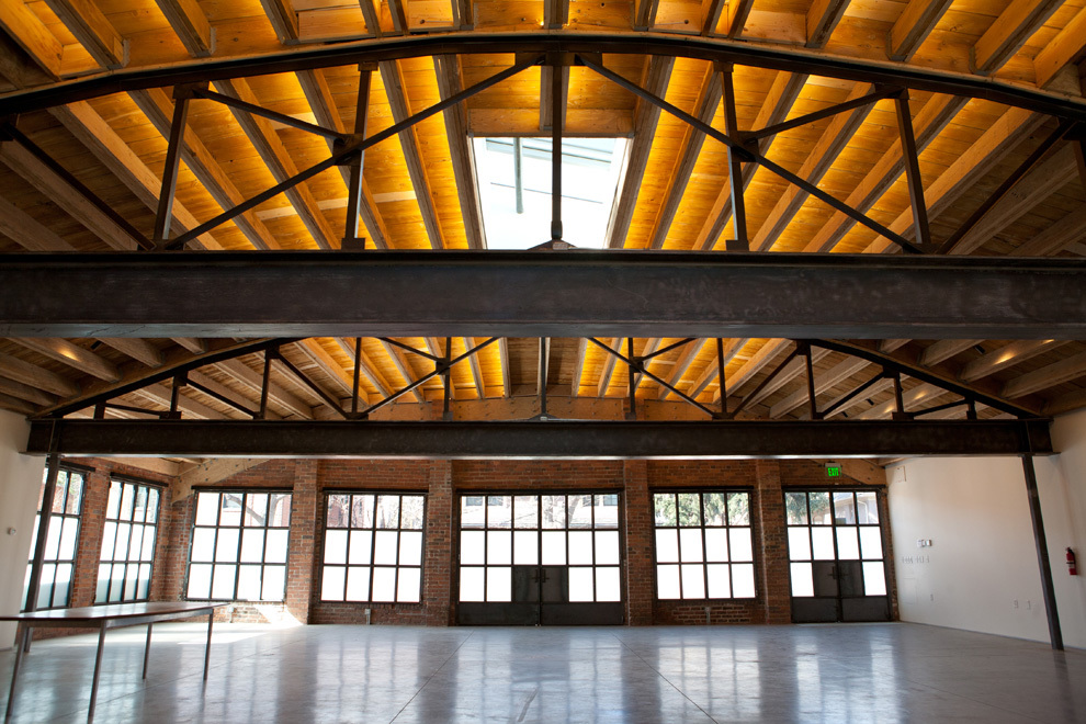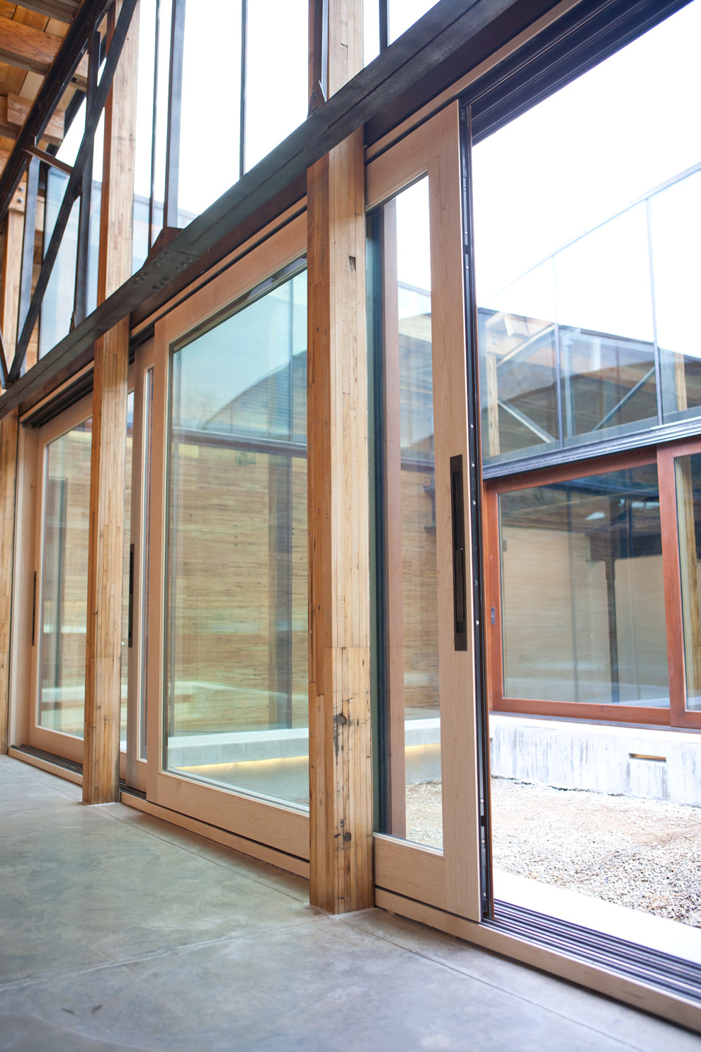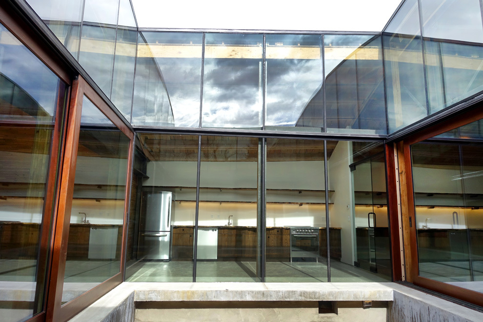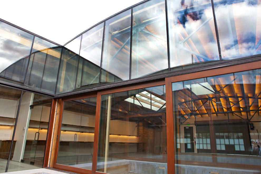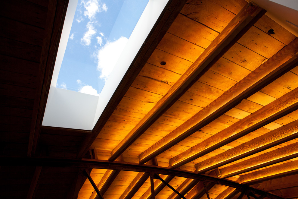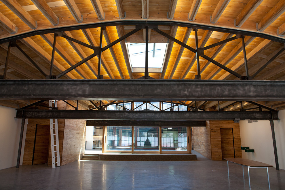 The other reason for removing the floor ahead of time was to place the entire heating, cooling, electrical, and data system into the bottom part of the building, whereas these systems are typically fixed to the ceiling. Inside, the barrel ceiling is shaped by aged wood and a bowed support structure. Through the application of an integrated design, we were able to switch the staus quo, liberating the openness and beauty of the space. The only building finishes introduced were glass and reclaimed boxcar flooring.