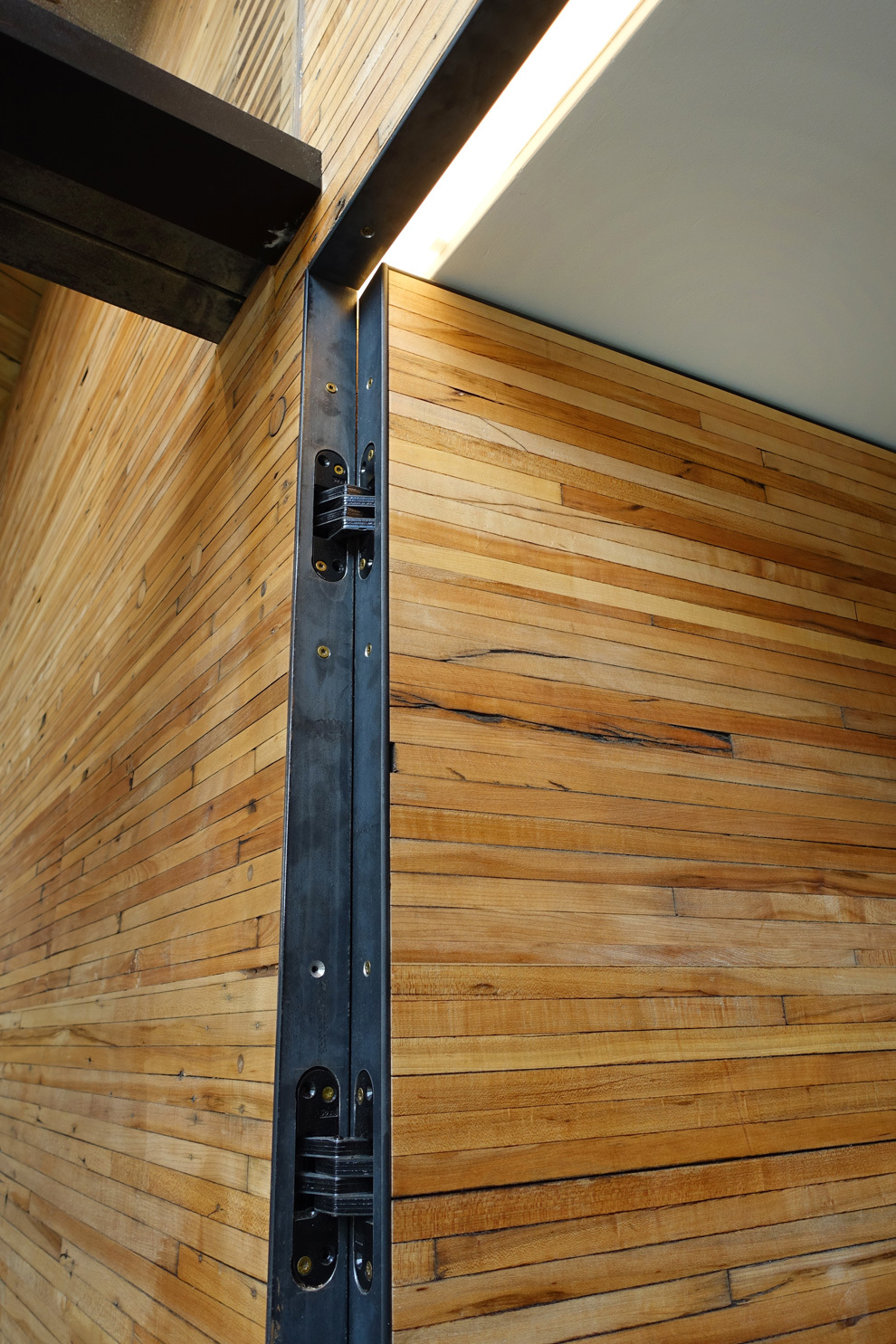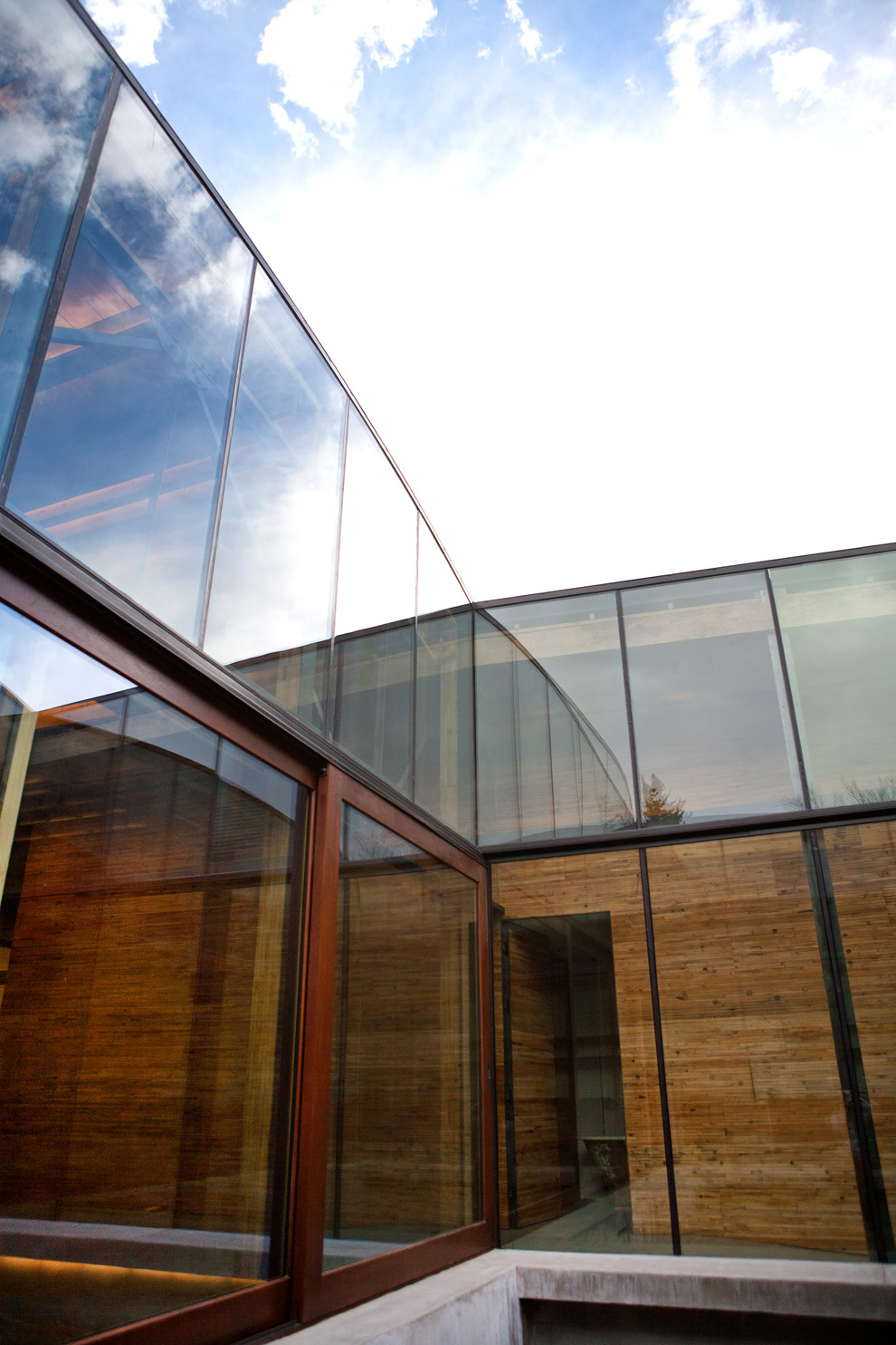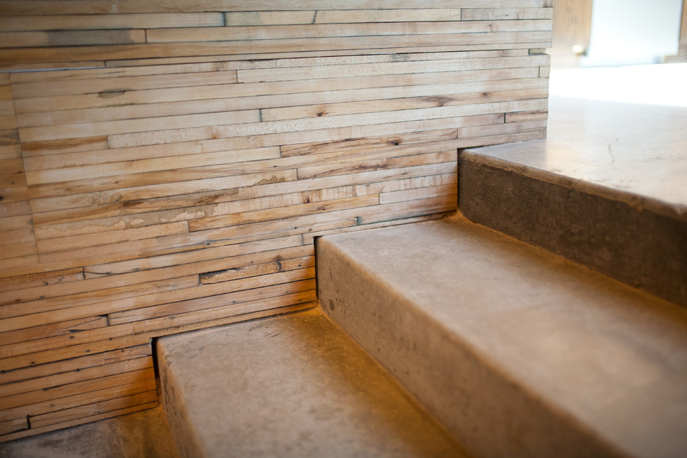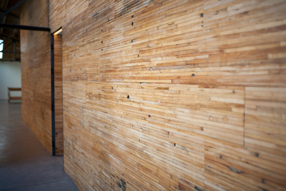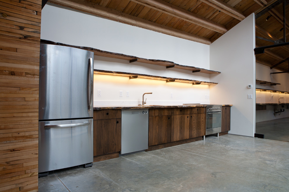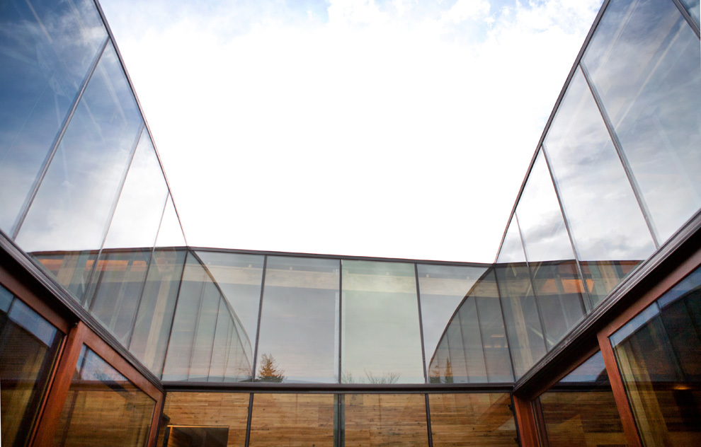 The other reason for removing the floor ahead of time was to place the entire heating, cooling, electrical, and data system into the bottom part of the building, whereas these systems are typically fixed to the ceiling. Inside, the barrel ceiling is shaped by aged wood and a bowed support structure. Through the application of an integrated design, we were able to switch the staus quo, liberating the openness and beauty of the space. The only building finishes introduced were glass and reclaimed boxcar flooring.