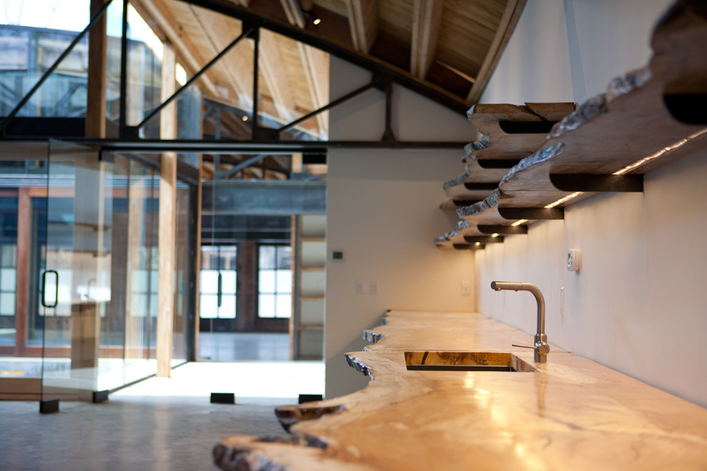 To bring in the daylight, a central atrium was created by cutting into the middle of the building, reducing the amount of square footage. What was lost in real estate is made up for with a healthy dose of sunlight and an immediate connection to nature. The part of the building that was the darkest (the core), is now the lightest, extending light into the entire space. Enclosed by 8 ft. glass sliding doors, the atrium is grounded by the Earth and opens to the sky. Vegetation and trees will be planted directly into the dirt. During the winter months, building inhabitants will see snow from the inside and on warm days, when the doors can be opened, fresh air circulates throughout. LED lighting was installed throughout the roof and atrium in discrete fashion. At night, when the LED lights are switched on, the atrium acts as a lantern.