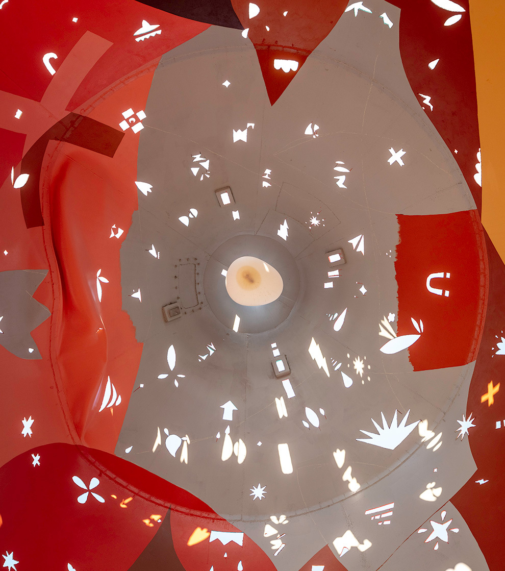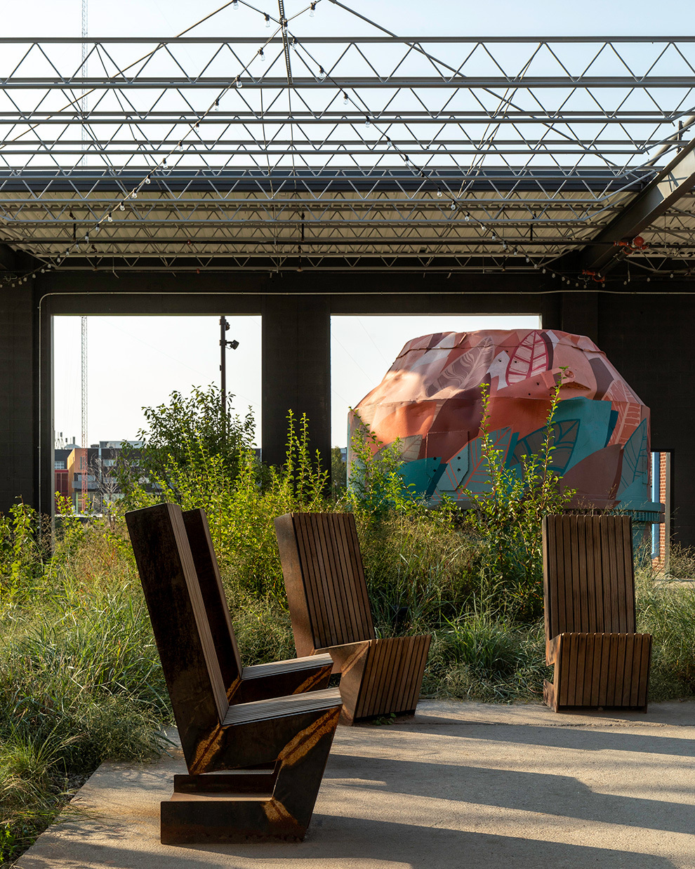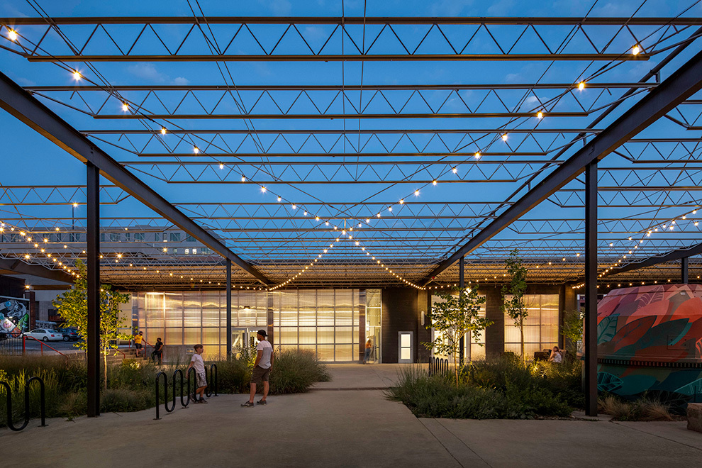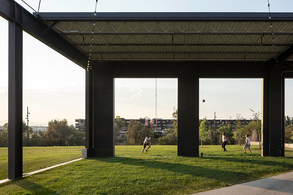 These spaces open onto a plaza and enhanced greenspace that connects to the pedestrian and bike path along the Platte. The plaza is home to an extensive public art installation featuring large metal hoppers reclaimed from a neighboring concrete plant. Artists Jaime Molina and Pedro Barrios of The Worst Crew, along with Tres Birds have repurposed the hoppers into sculptures throughout the plaza and park.