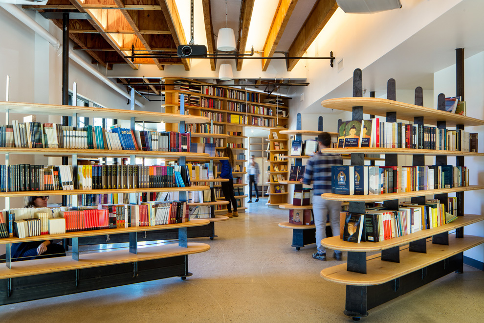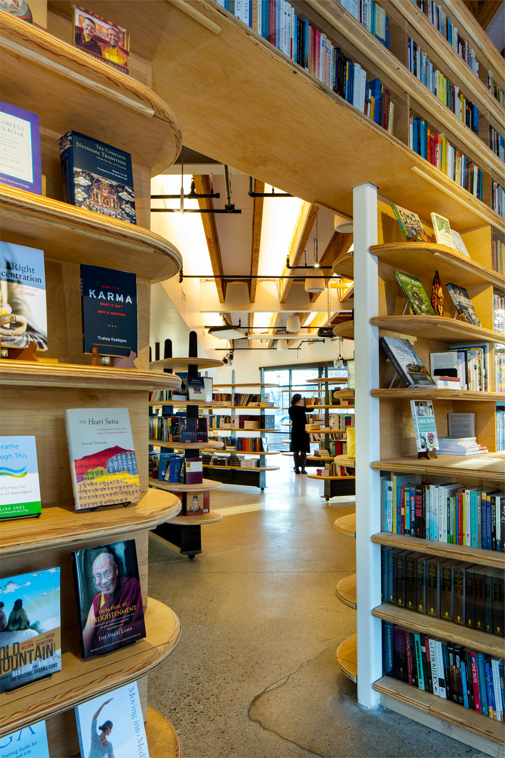 With the change in location came the addition of a public bookstore, defining the main feature of the project. Here, every title published in Shambhala’s thirty-five year history is represented, giving visitors immediate contact with the company’s mission and purpose. Built using reclaimed boxcar flooring, the bookshelves exist on a pivot system, providing flexibility and adaptability of space. The shelving uses compression and gravity as a means of construction, eliminating glues and improving the quality of the air.