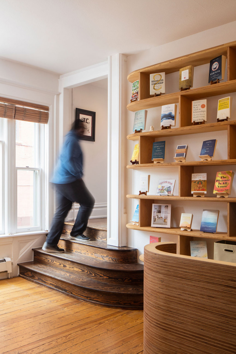 Tres Birds Designed and built a new reception desk from Baltic Birch plywood, and the drops were used to create a bench at the front entry. Behind the reception desk the Shambhala emblem was re-installed on a hidden door leading to an under-stair storage space.