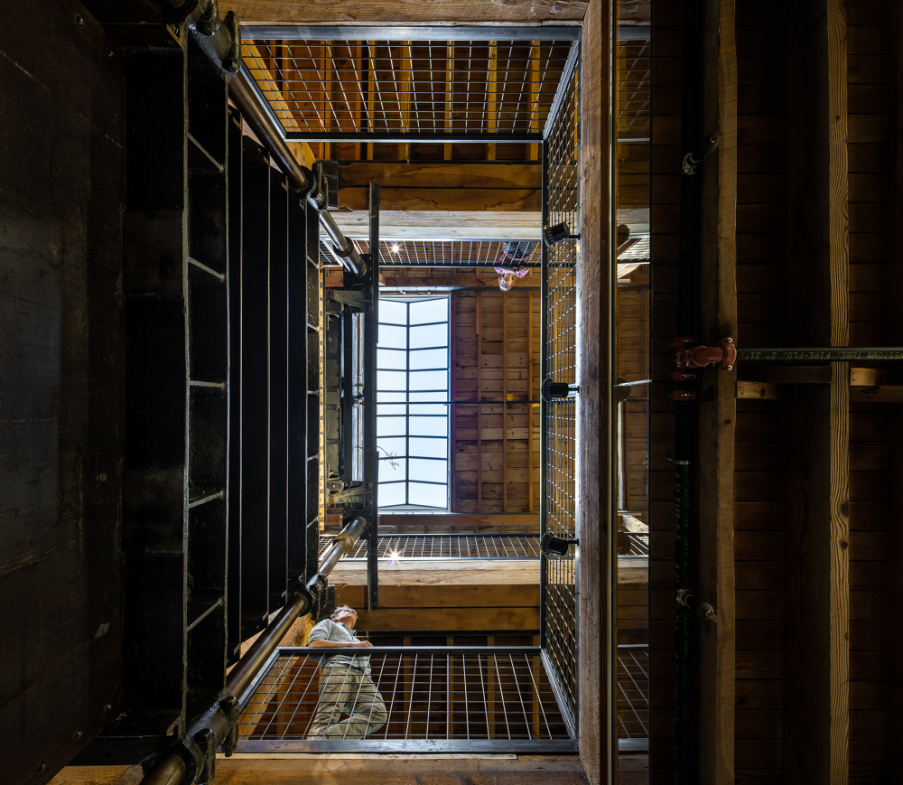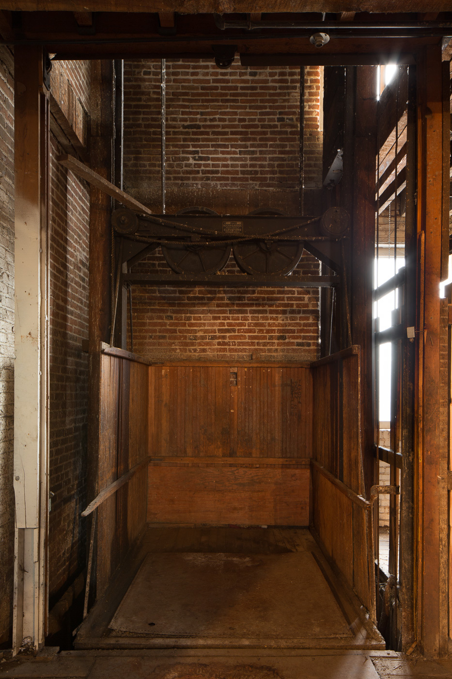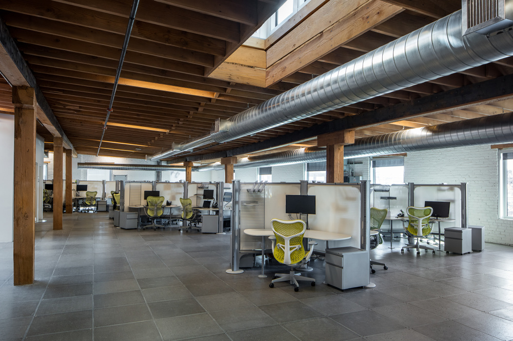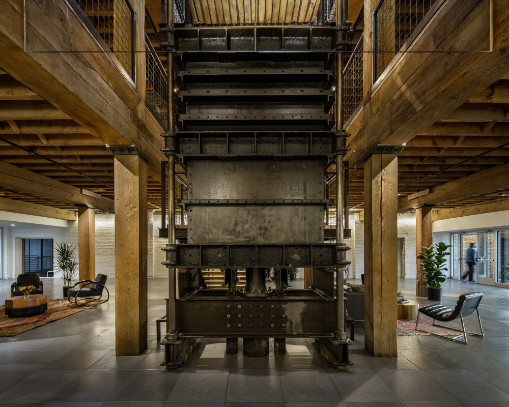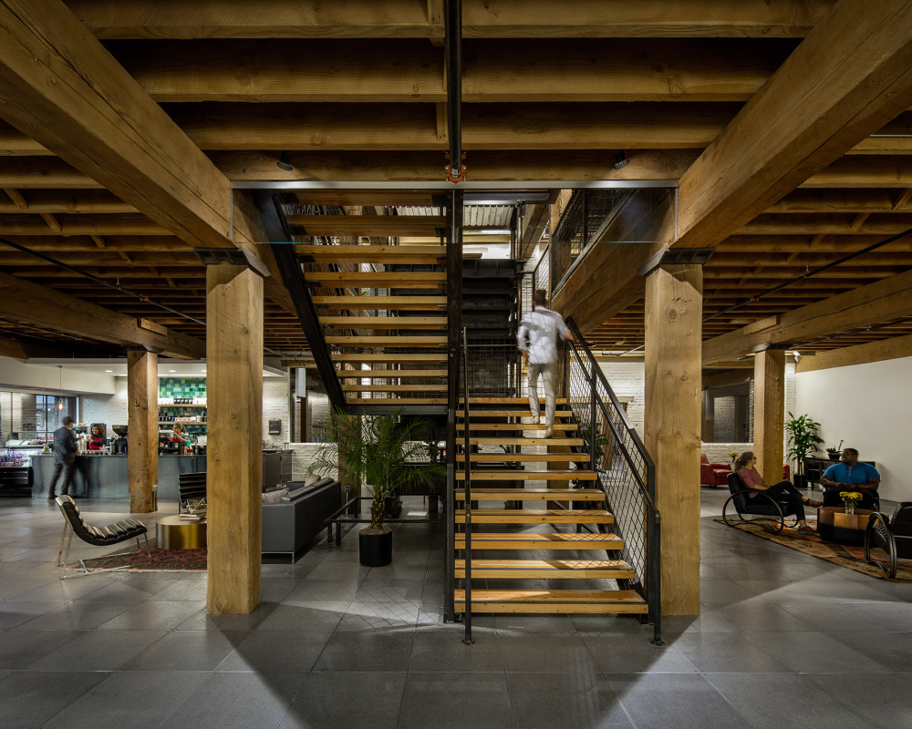 Tres Birds set out to open up the space, finding opportunities for fresh air and natural light. Tenants and guests now enter the building through an anchored industrial elevator, revealing a recessed building “facade” and partially enclosed walkway flanking the west-facing perimeter walls. The recessed front doors open to a cafe and three story rag baler: a remnant from the building’s days as a rag recycling facility, now polished and encircled by a custom, glulam wood staircase.