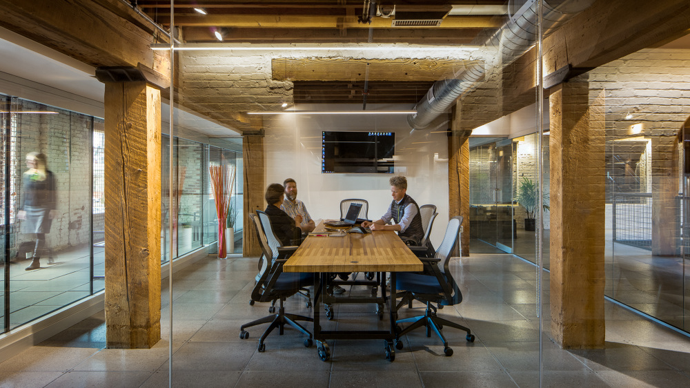 Inside, the structure was restored to highlight original elements—years of wear scraped from the brick walls and wood flooring. Floor plates and walls were strategically removed to foster visual connections across disparate spaces. Concrete floating panels serve as walkways while simultaneously housing necessary wiring for future tenants. Custom conference tables were installed, made from repurposed pine bowling alley lanes. The layout was designed to be adaptable, energetic, and open while providing the amenities, security, and privacy desired by dynamic, modern companies.
