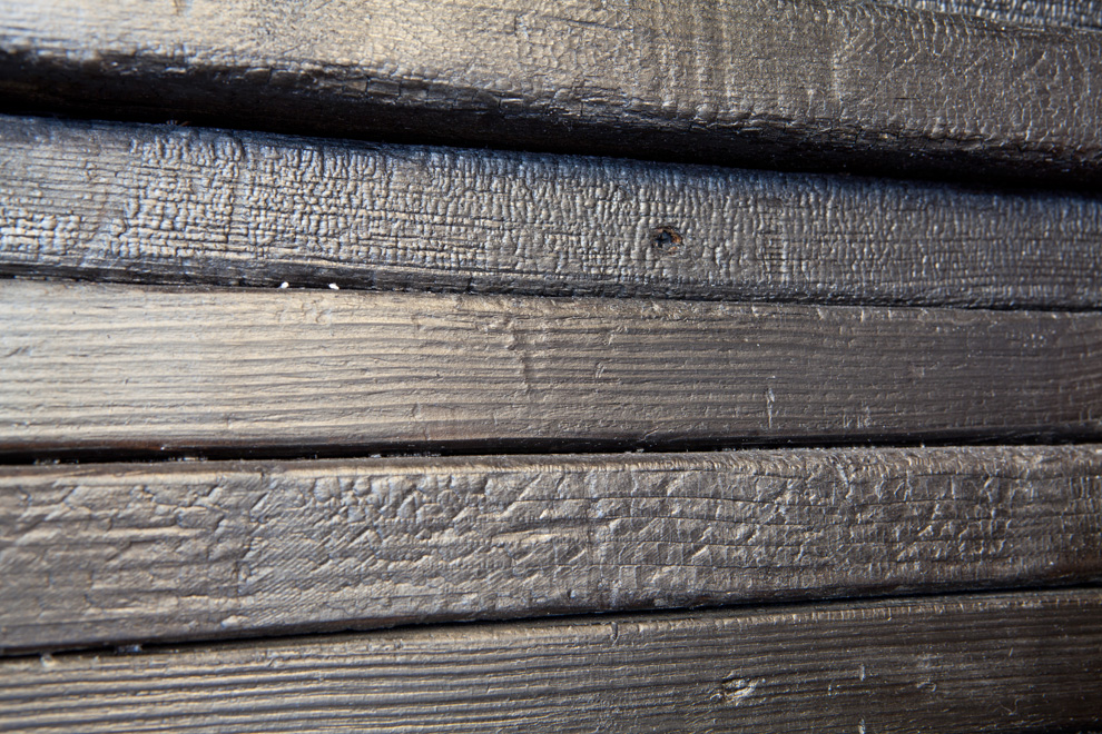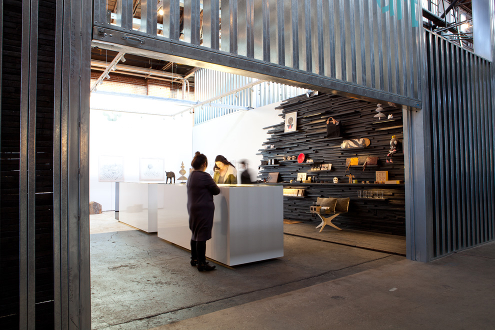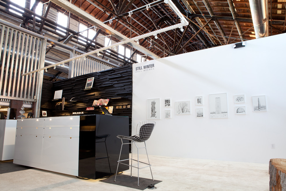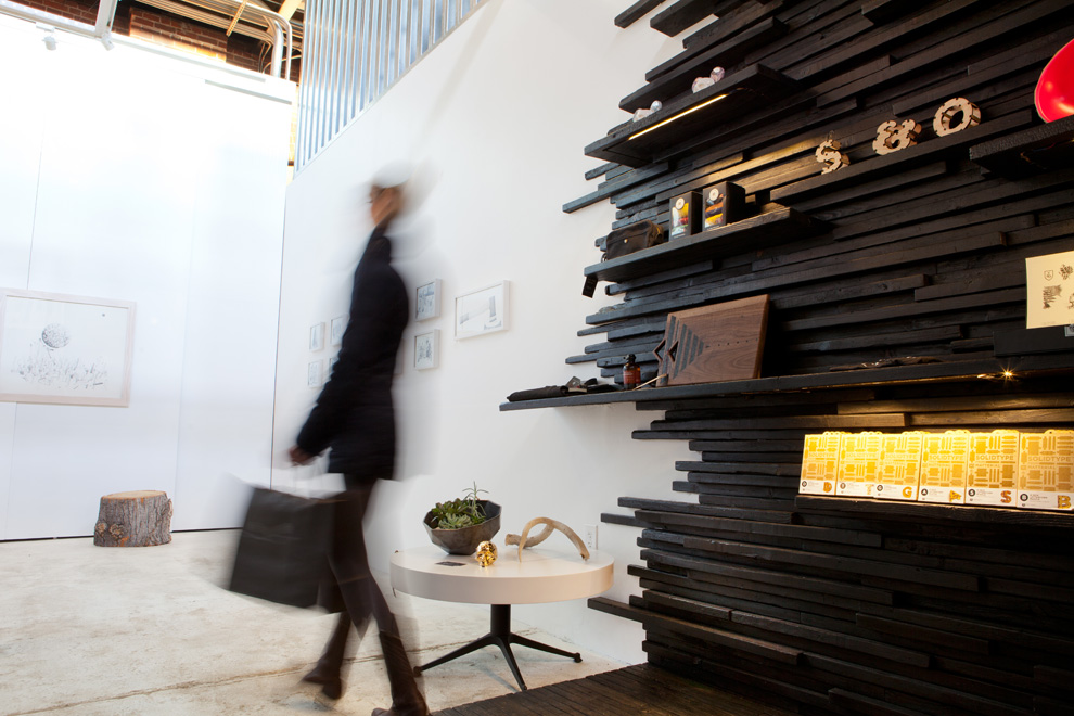 Tres Birds began by looking at the context of the building itself. The Source is located in an old foundry building that was once used to repair locomotives. In similar era buildings, wooden racks were used for warehousing. With the advent of fire safety and code, tons of this wood material was subsequently displaced. Repurposing this wood material and connecting it with the building’s history in coal-firing industry, Tres Birds presented the idea of using burnt wood (inspired by traditional Japanese process called shou sugi ban) in the retail section to create texture and contrast to the stark white gallery walls. Once the construction phase commenced, the client was set up at Tres Birds to burn each piece of wood by hand and later install it themselves.