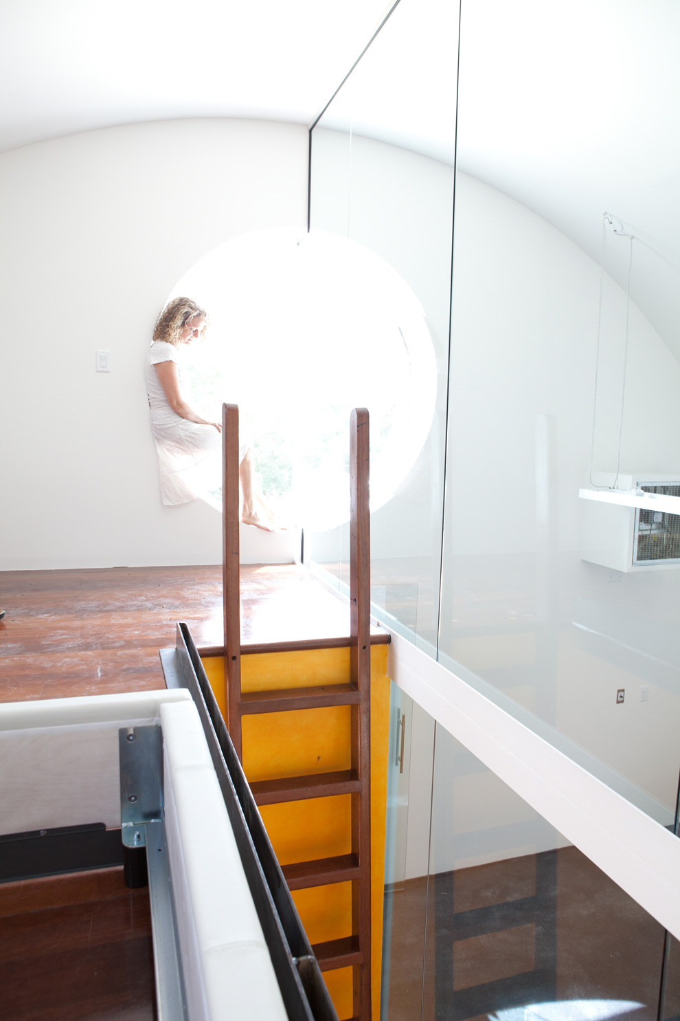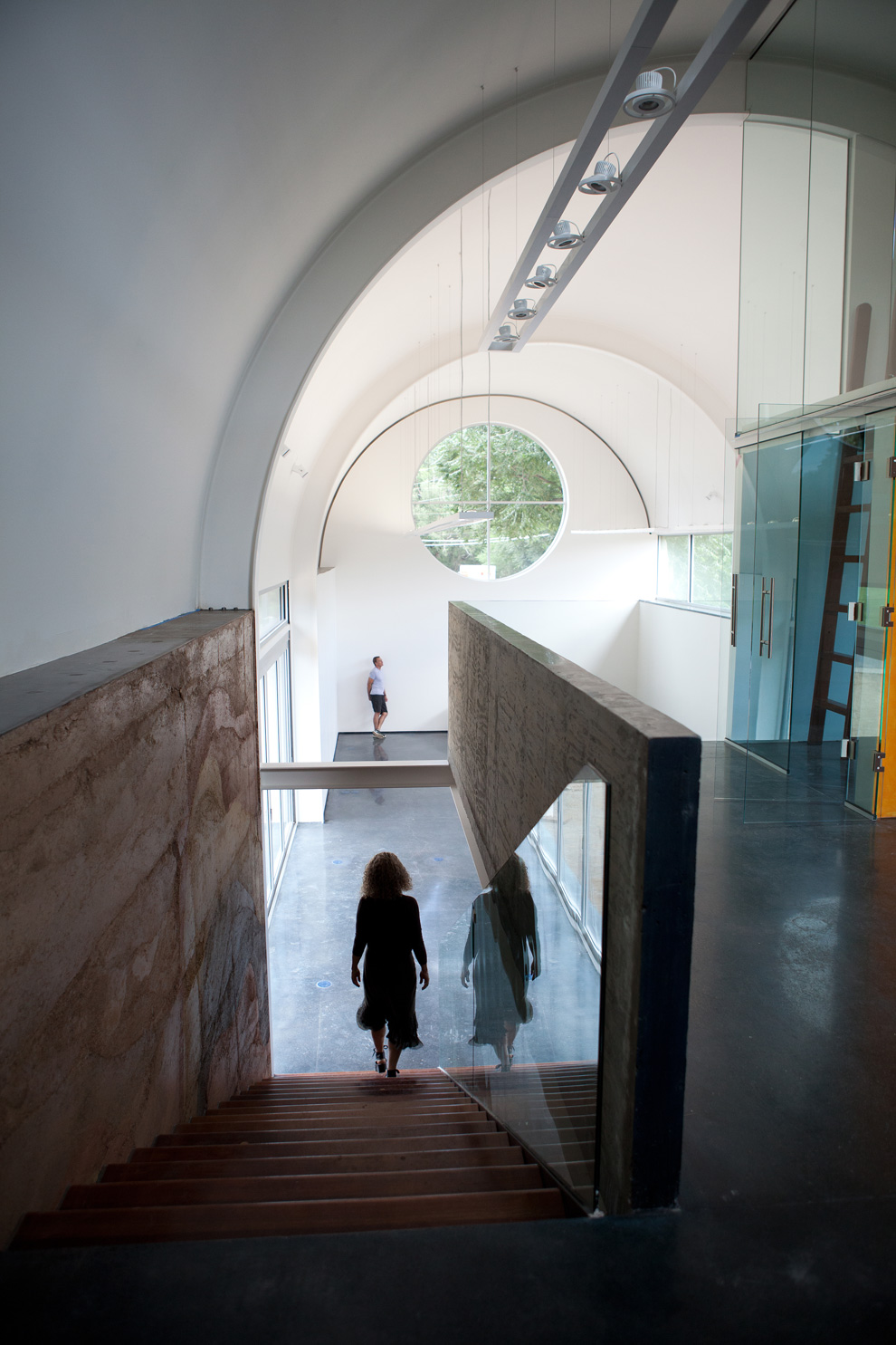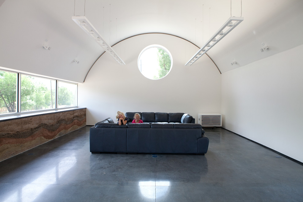 Fulfilling a sense of wholeness, the design of the two-building structure is based on circular patterns. The ends of the buildings were created using tilt-up concrete walls and were poured on site. Windows cut into perfect circles create portals to the outside and allow for heavy light penetration inside.