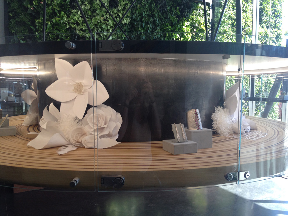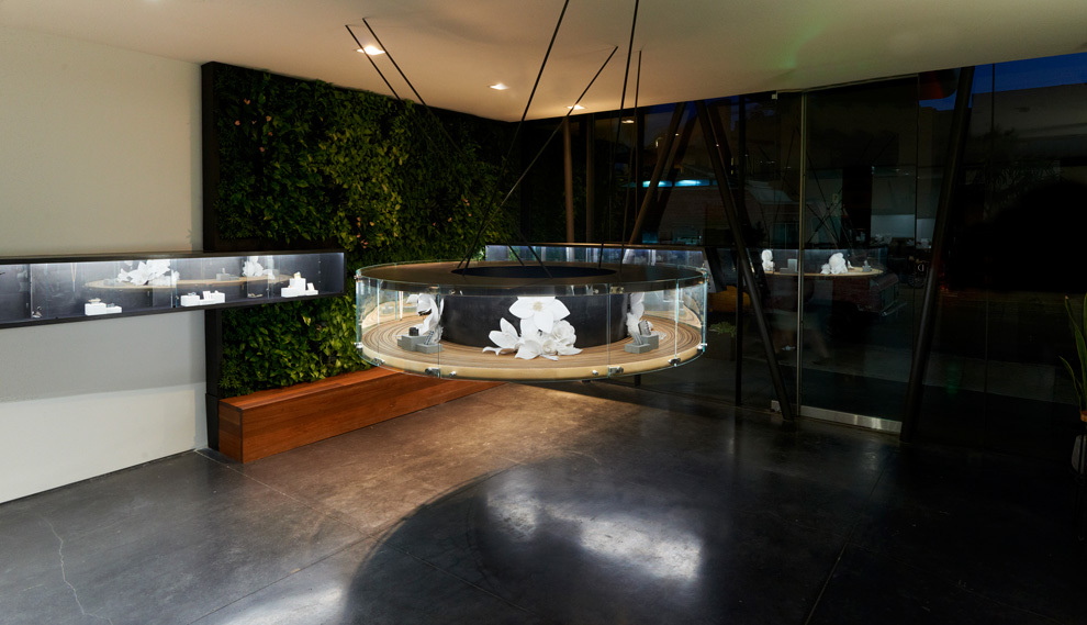 Tres Birds created a program throughout that is heavy in security, while preserving lightness of space. Upon entrance, a central display case hangs suspended from the ceiling and guides onlookers in a circular motion, allowing several people to experience viewing privacy at once. To the back of the first floor and separated by a glass wall, is the transparent workshop where jewelry making can be witnessed on site. As visitors ascend, the second floor becomes increasingly intimate. A series of secure pods give sales associates the opportunity to meet more closely with individual clients. High profile visitors enter from the back of the building and are guided to the third floor, where only the most serious jewelry buying takes place.
