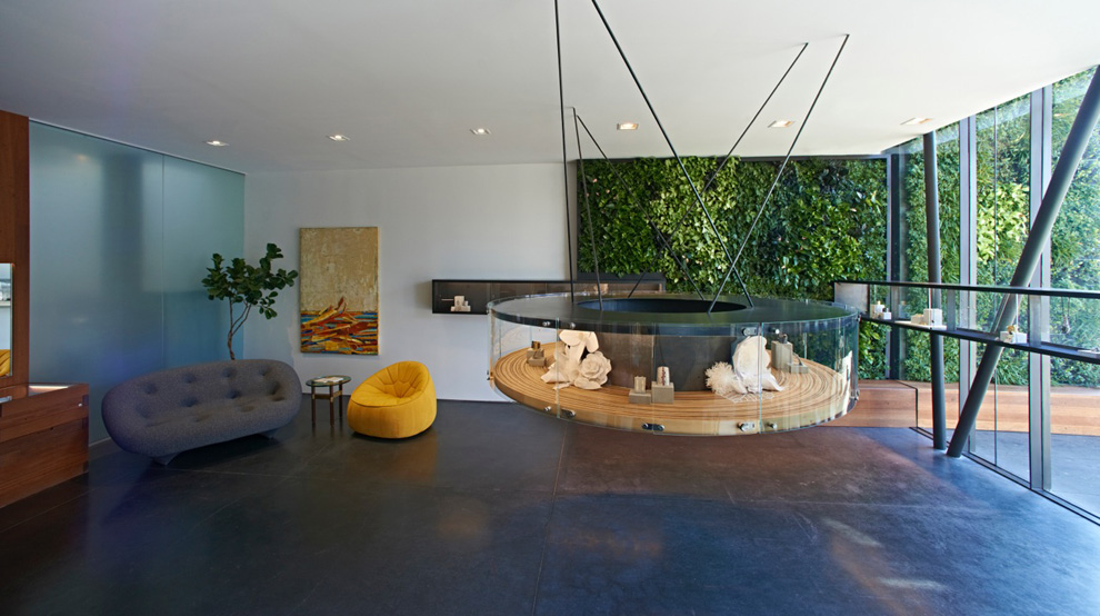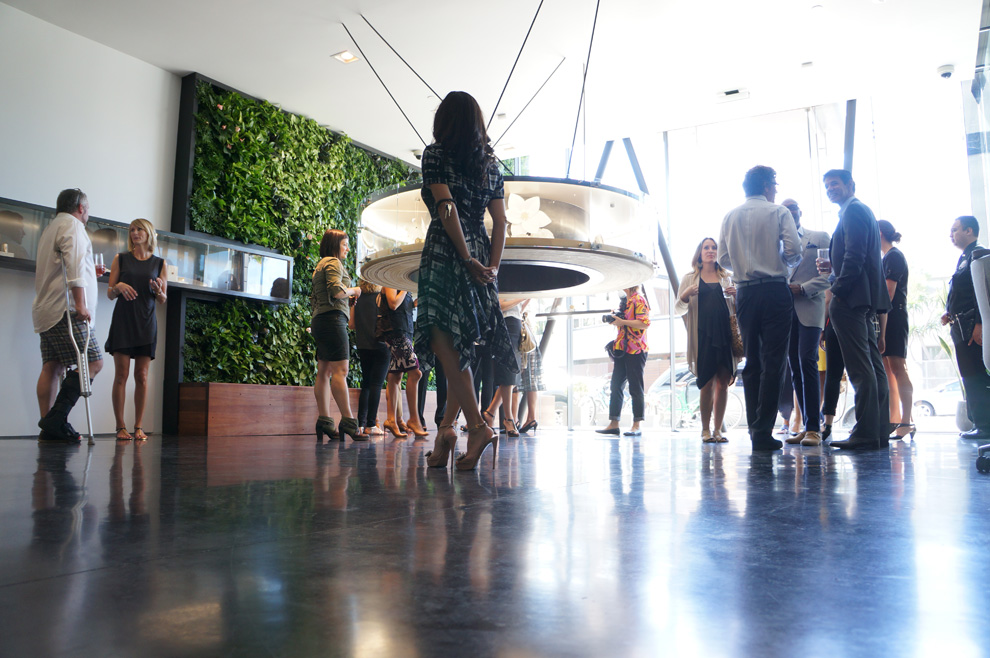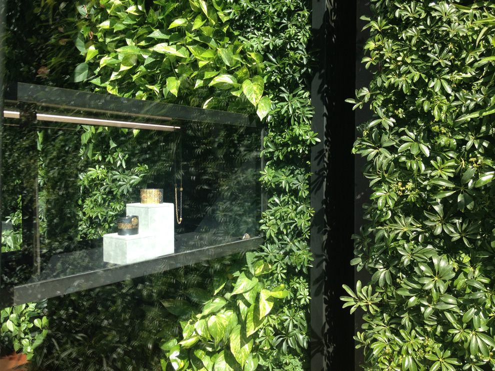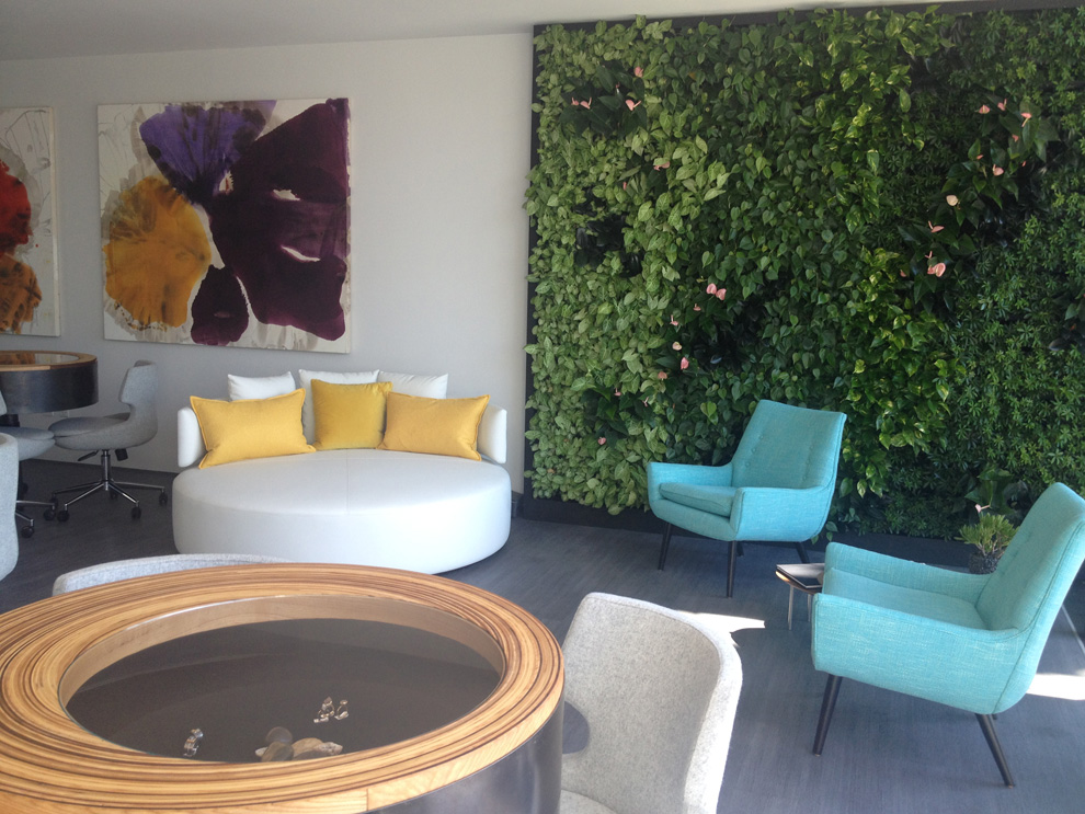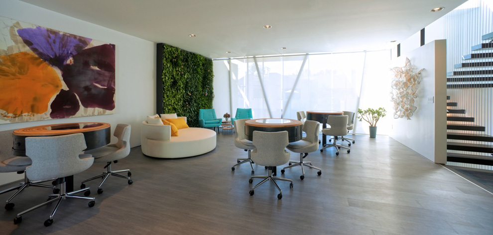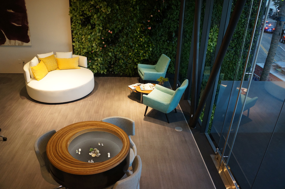 With the intention of doing more with less and inventing custom solutions for the inherited framework, main interior features address multiple functions. The most prominent feature is the indoor/ outdoor living green wall that dampens sound, softens and brings life to the immediate environment, ionizes the indoor air quality, as well as creates a visual identifier of the Todd Reed brand. The wall extends to the height of the first two floors, while connecting interior and exterior space. A single wooden bench anchors the bottom of the garden wall, where inside and outside visitors alike may find respite. With only a single pane of glass between the two, visitors can physically be on different sides while experiencing a shared interaction.