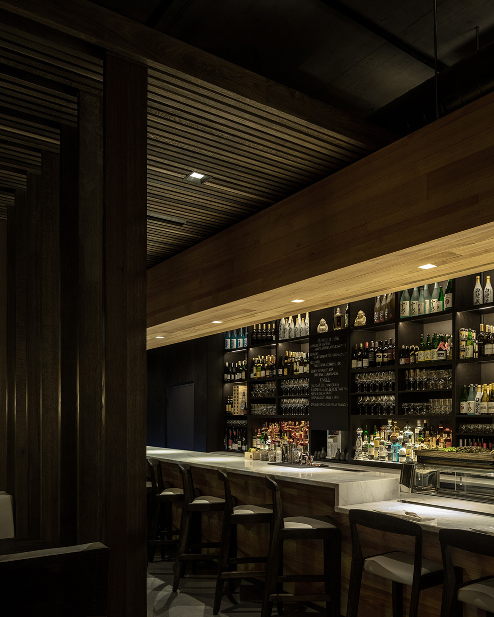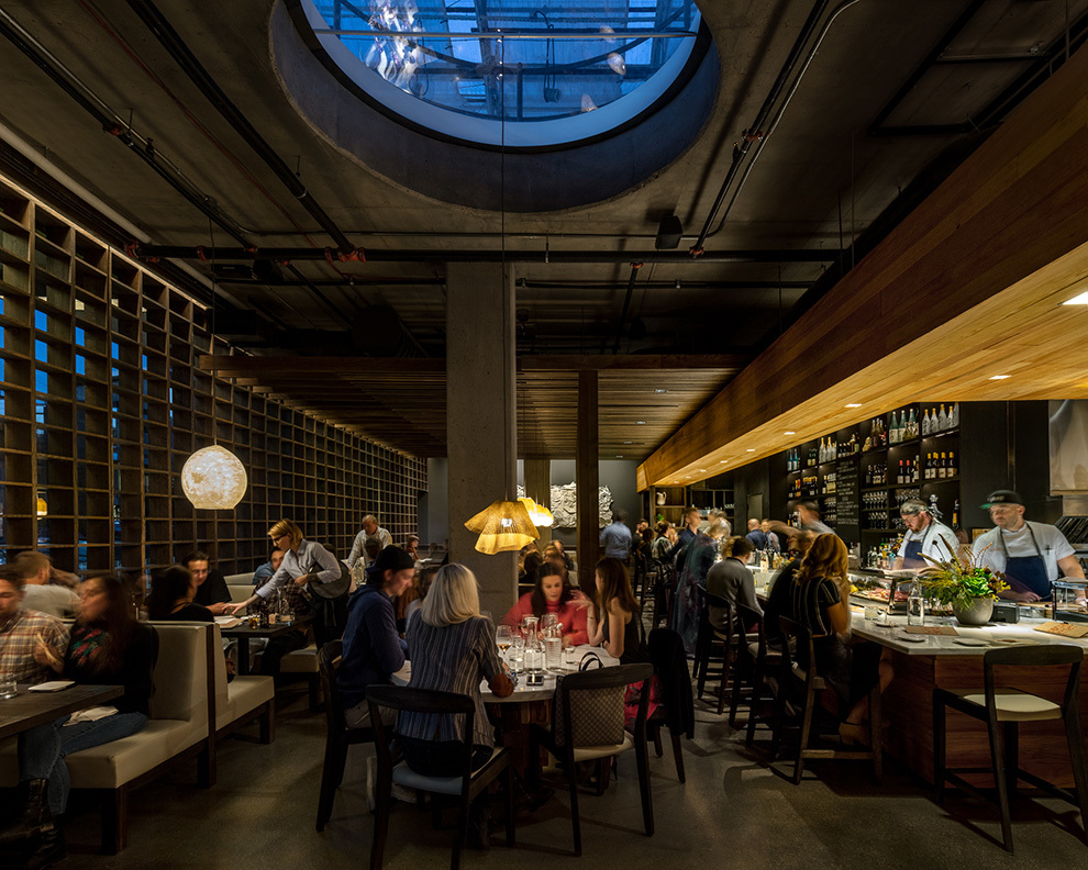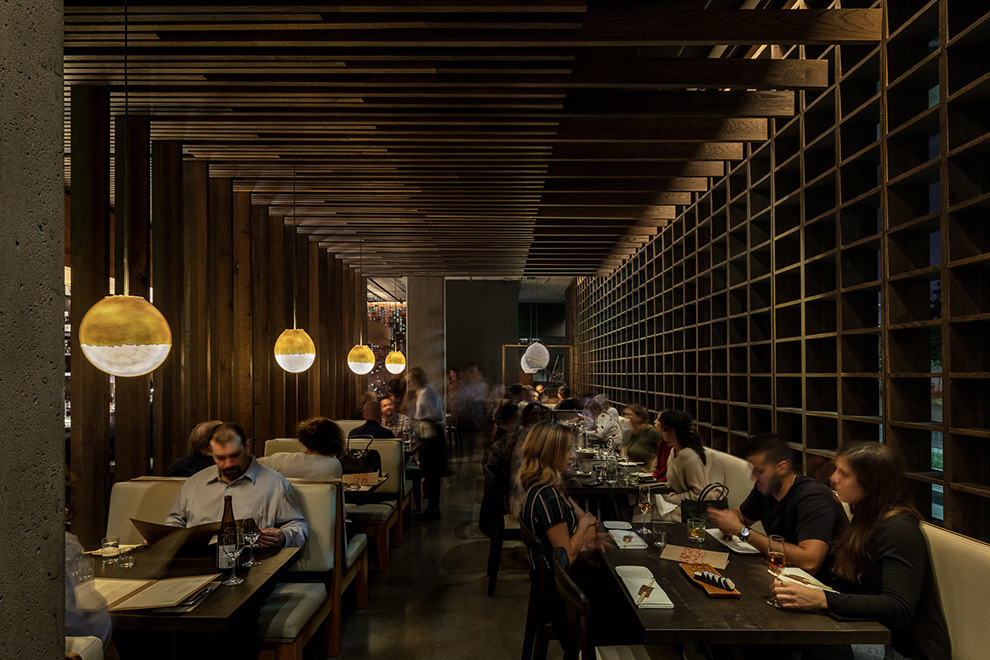 Using Tres Birds' experience in Japan (with completed projects in Tokyo and Osaka) as a foundation, the firm was able to bring Japanese sensibilities to the table while incorporating that which makes Denver unique. Native lumber and reclaimed materials were used throughout the restaurant, like the massive Douglas fir door that’s accented with utilitarian steel.