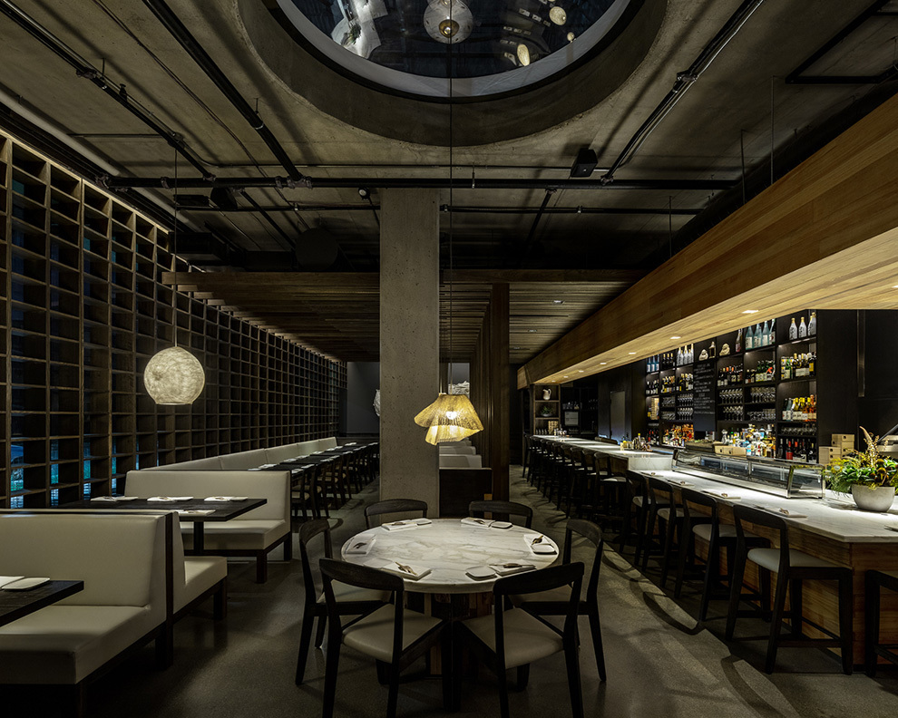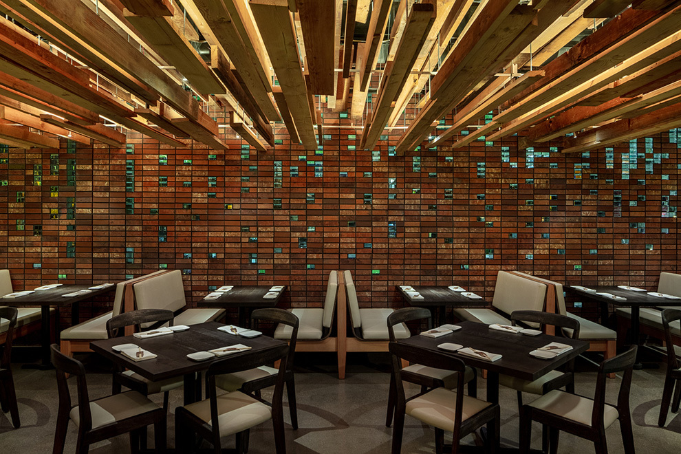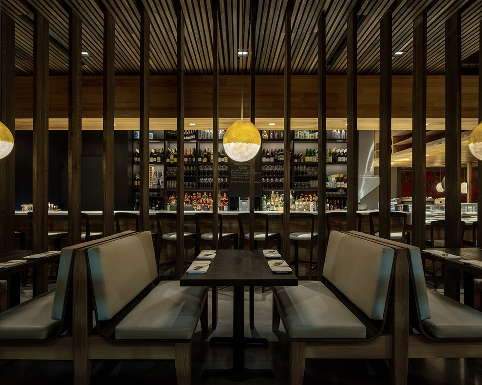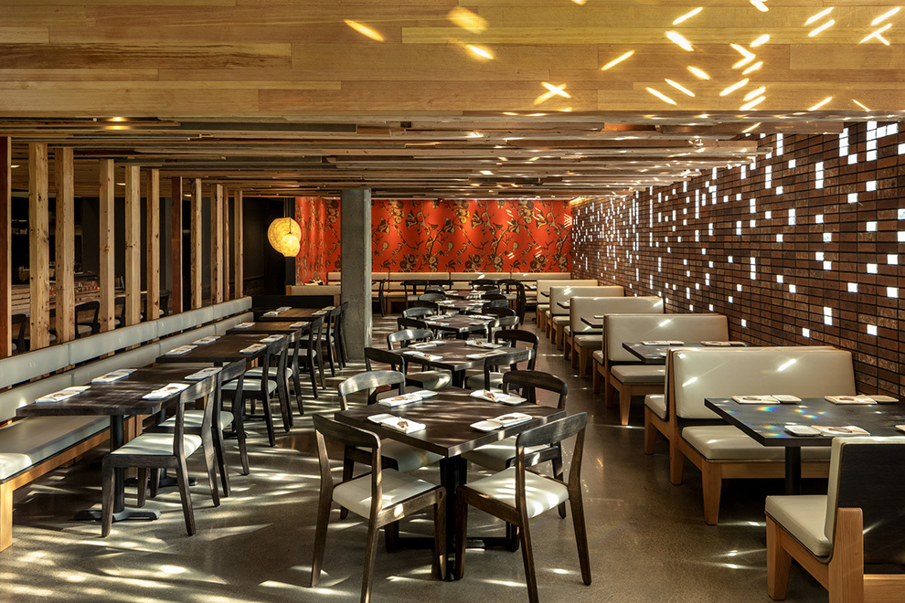 The balance of light and dark makes the space compelling -- the raw lumber ceiling (which doubles its duty as sound-dampening) contrasts with the black accents around the room. Shoji screens provide a lightness while the boldness of the Austin restaurant’s iconic red flowered paper makes a statement. A 70-foot white marble sushi bar serves as a connection between the two dining rooms, and large parties can dine under a magnificent eight-foot oculus with views up to the delicate vines of the greenhouse above.