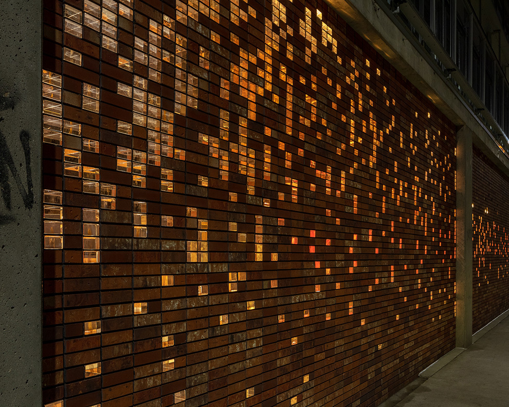 The southern wall grabs the immediate attention of the guest after passing through the entry. A Tres Birds innovation, the wall is a composite of red and crystal bricks that refract the light as it streams into the dining room. As the sun sets, one can peer out from the inside to see the Denver skyline.