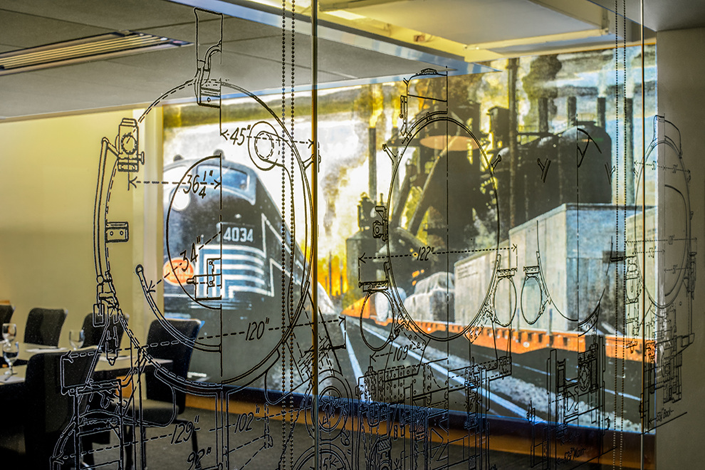 The light boxes are comprised of grid LED’s, and can be color-temperature controlled via phone app (changed to blue, orange, green, etc. with the touch of a button). The photographs are largely images of Denver’s forbidden areas, printed on fabric and stretched across the oversized light boxes. Artist Christopher James is a fence-jumper, and has amassed a collection that draws attention to some of Denver’s less known areas. A series of paintings line the conference room façade: train imagery by American artists at the turn of the century.
