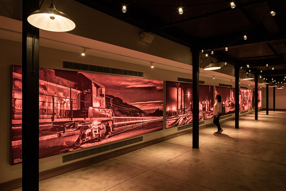 Functionally, the basement includes public restrooms, conference areas, event spaces, and a kitchen. Between January and March 2017, Tres Birds designed and installed a series of large light-boxes (up to 80’ in length); layered with black-and-white photography by local, Denver artist Christopher James; and paired with vintage paintings of trains from the early 1900’s.