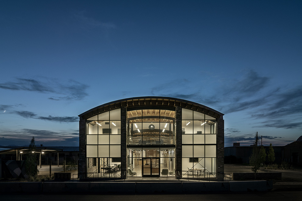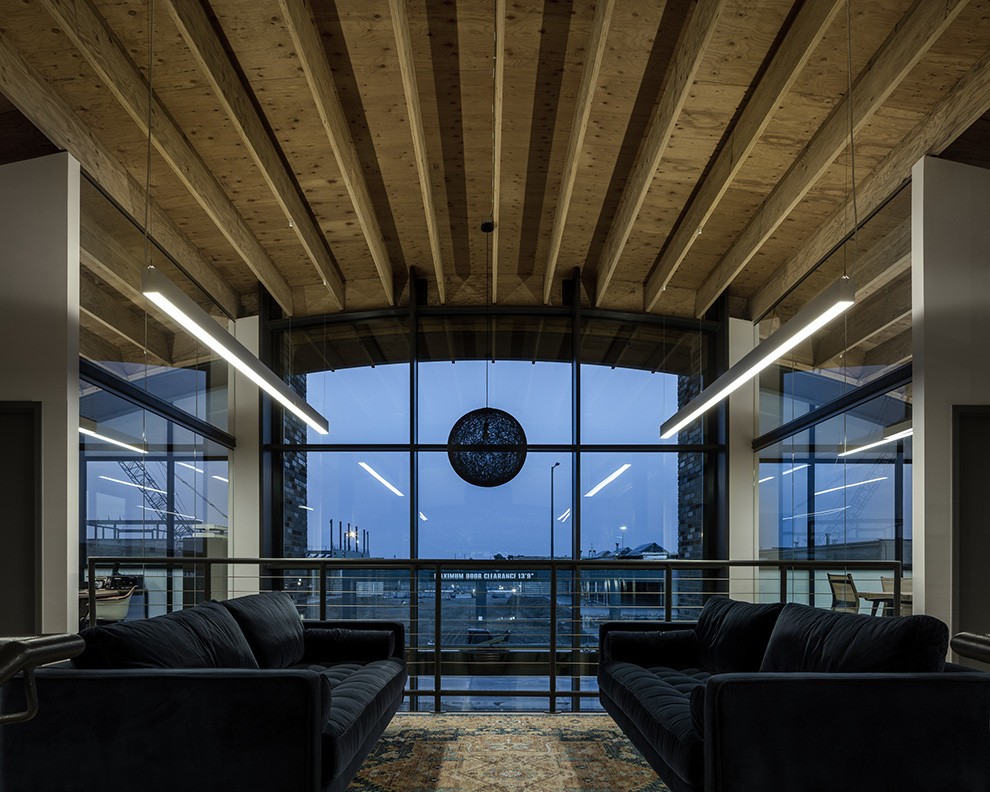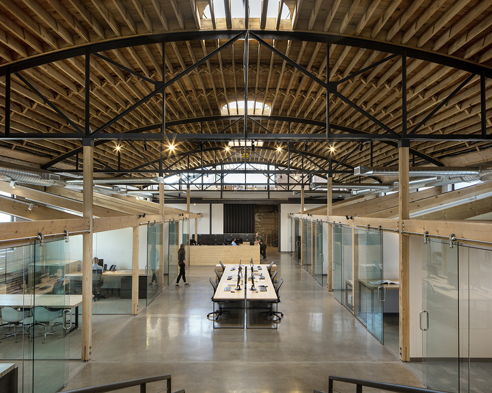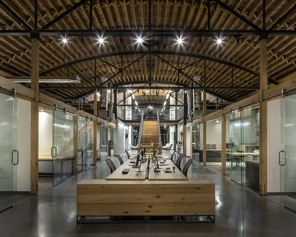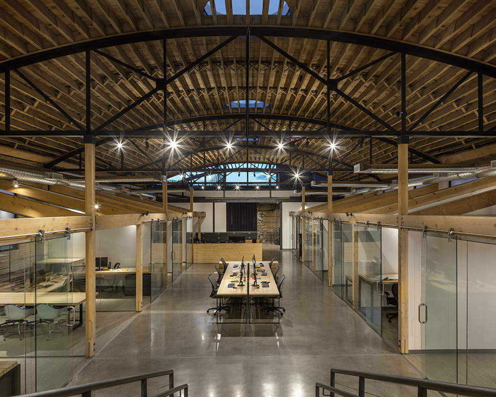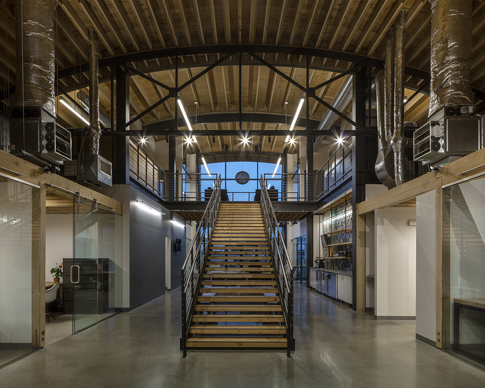 In constructing the new two story building, the barrel vaulted shape of the old warehouse was kept, though reinterpreted with engineered wood products. The materials used to keep the space warm and natural: Raw plywood, exposed joists, and structural steel beams were all rolled into the profile. Pieces of the 1940s construction were sandblasted, oiled, and left raw as a highlight of its historic quality.