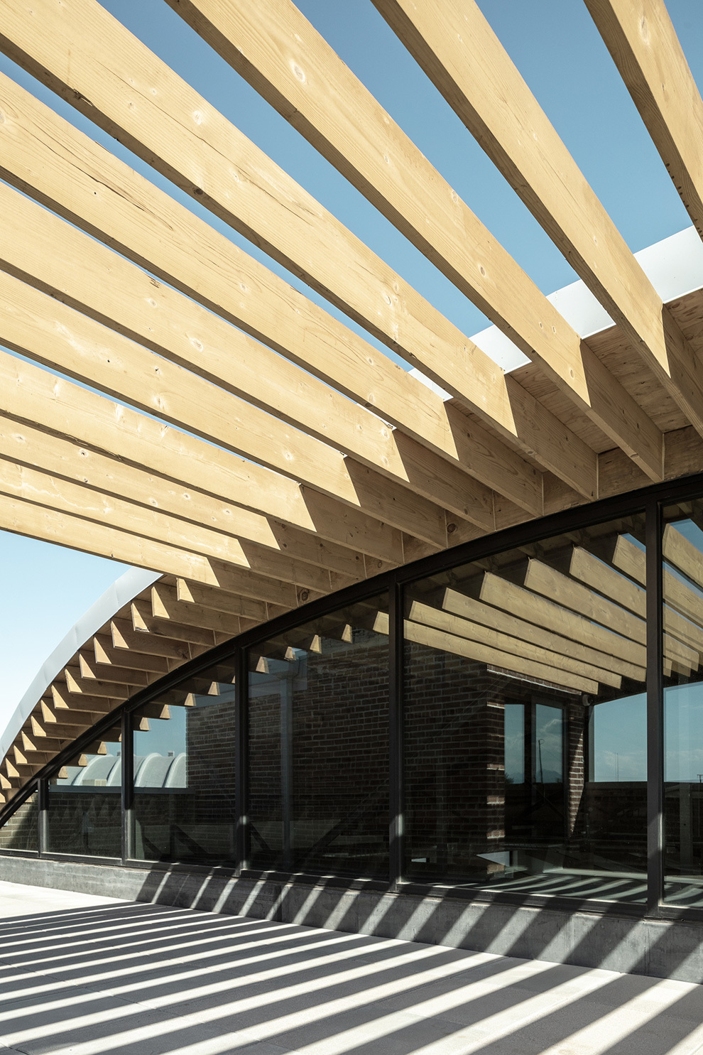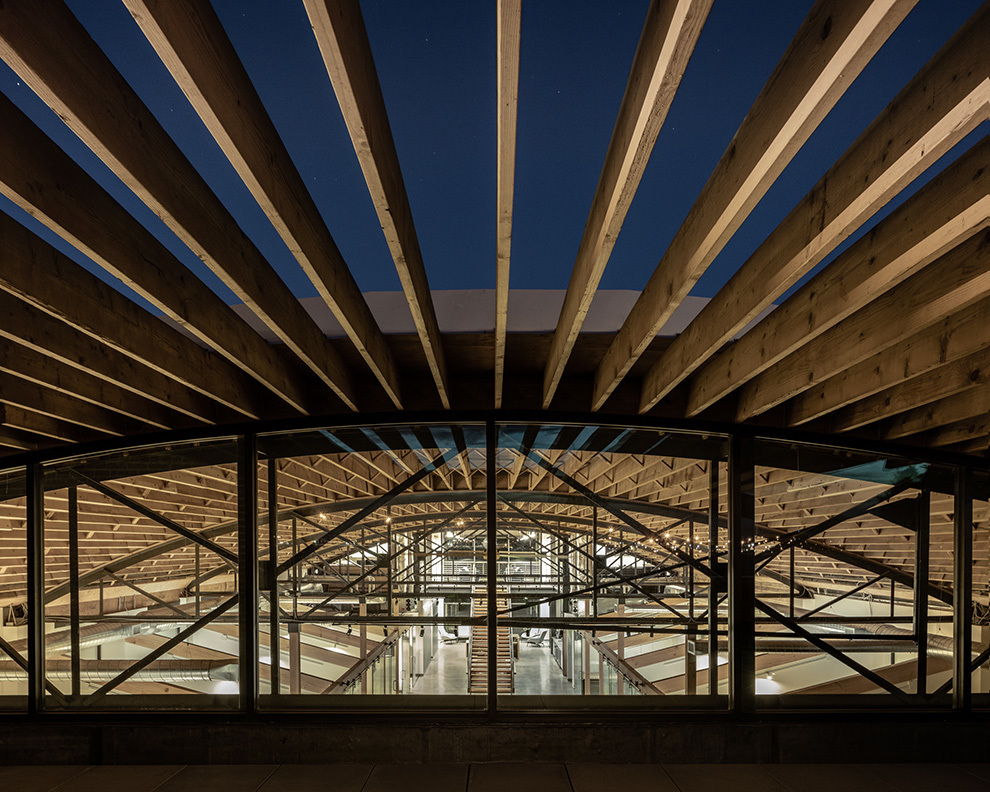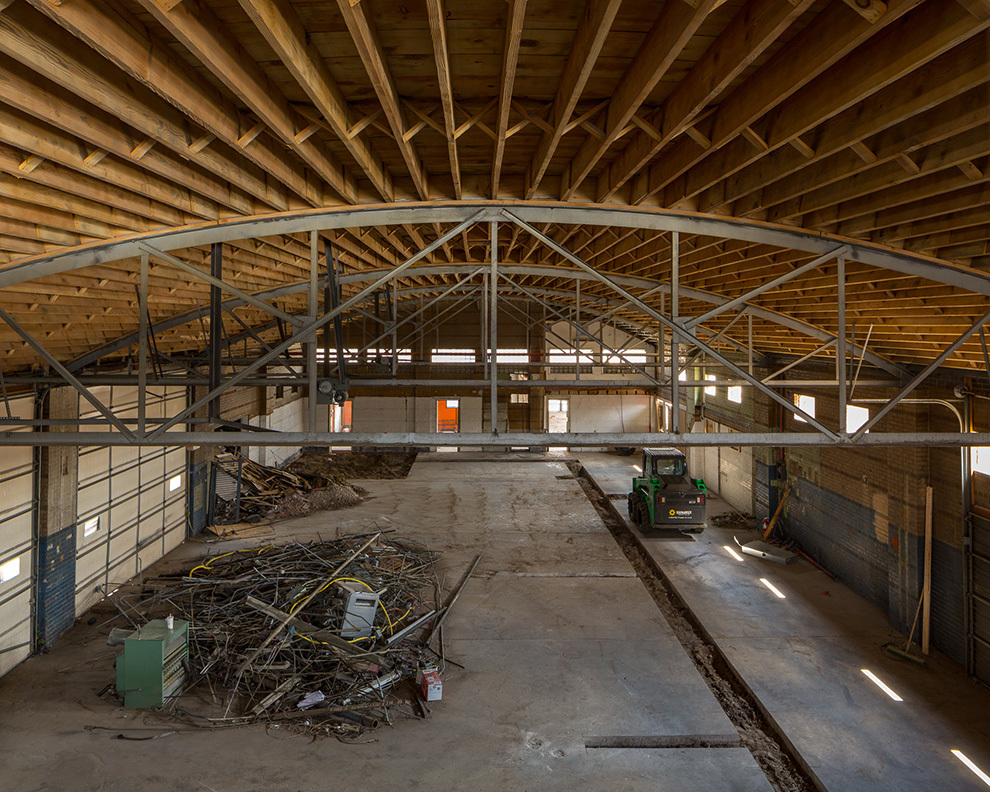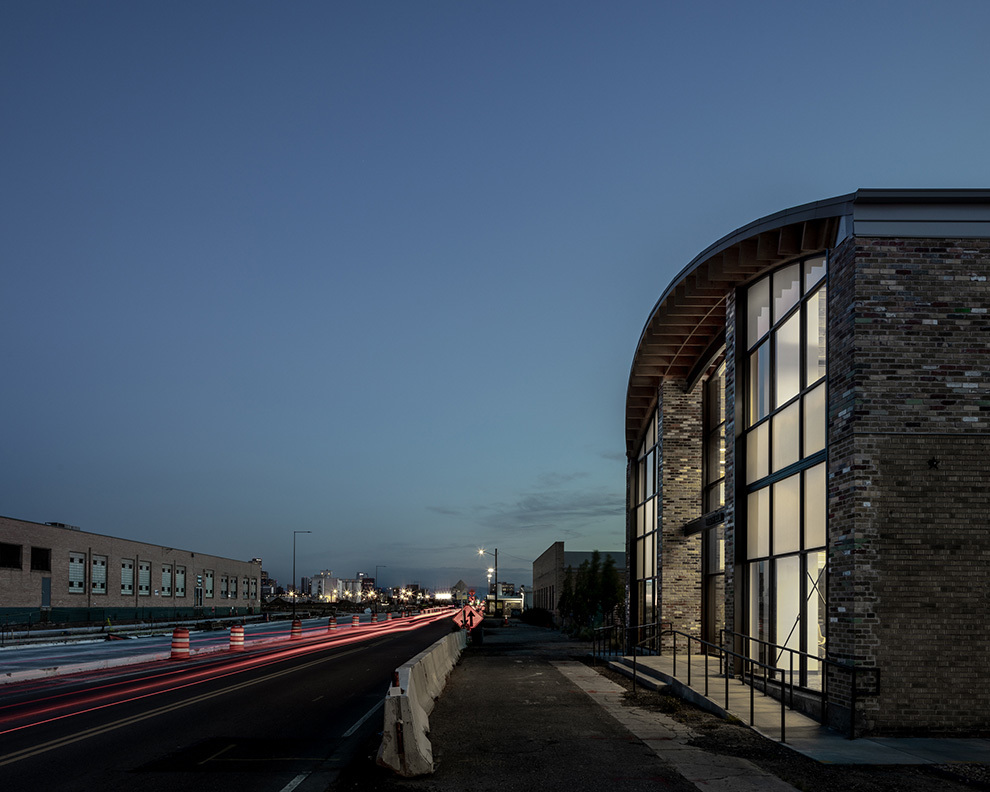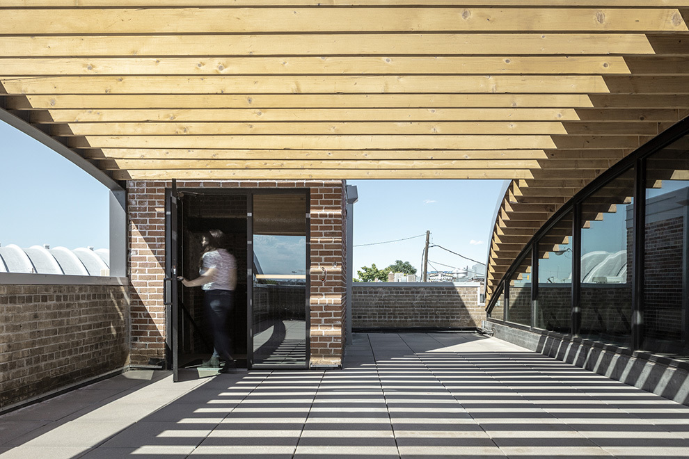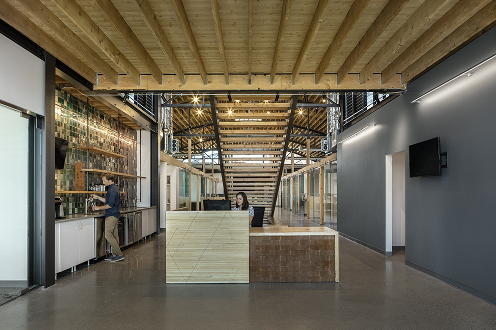In constructing the new two story building, the barrel vaulted shape of the old warehouse was kept, though reinterpreted with engineered wood products. The materials used to keep the space warm and natural: Raw plywood, exposed joists, and structural steel beams were all rolled into the profile. Pieces of the 1940s construction were sandblasted, oiled, and left raw as a highlight of its historic quality.