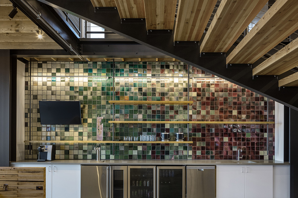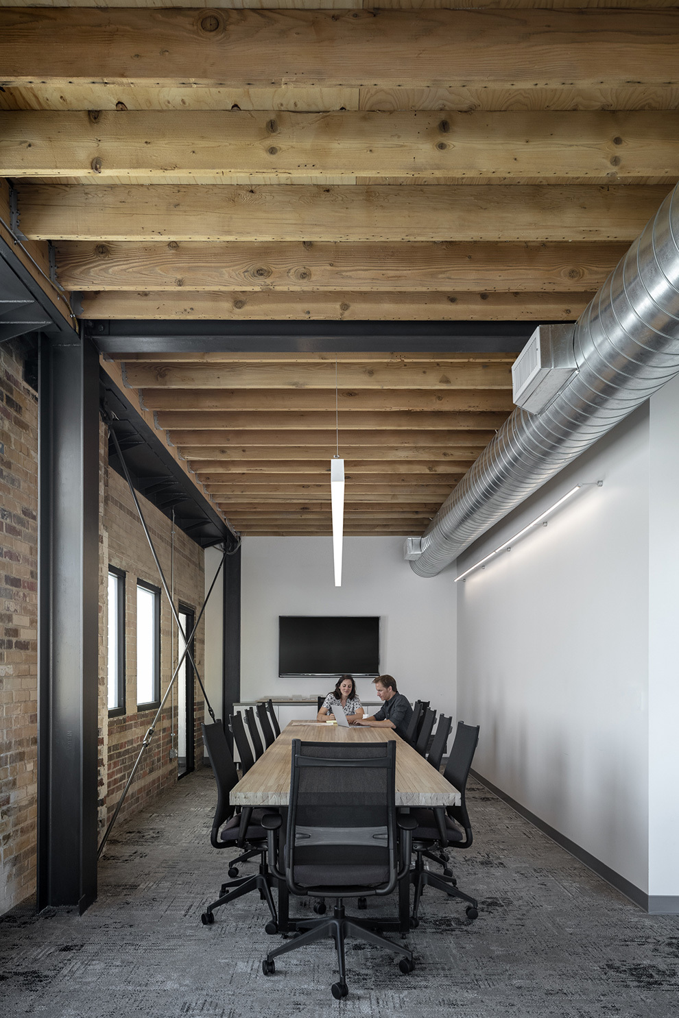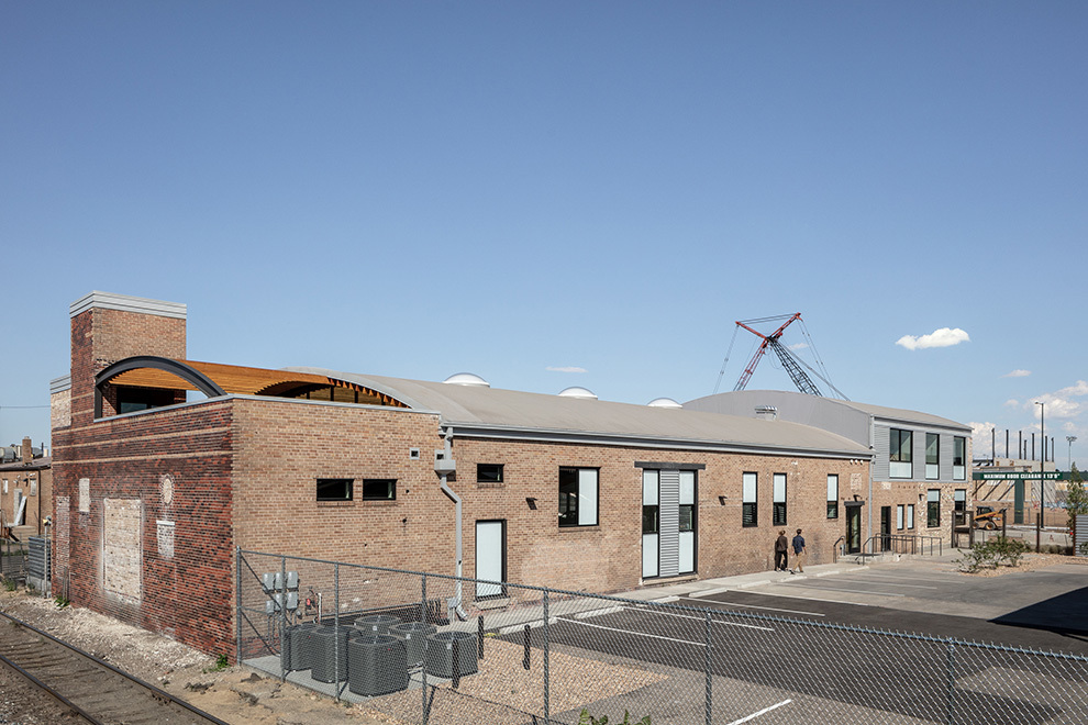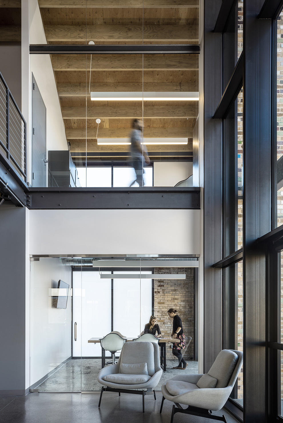 Saving an existing building is often one of the most sustainable practices an architecture and construction company can do as compared to demolishing an existing building and building a new building in its place. The embodied energy necessary to take a building down, haul it away, and replace it with all new materials and labor can be counterproductive. Translucent glass, a unique glazing process, and exposed interior brick walls all increased the thermal value of the building.