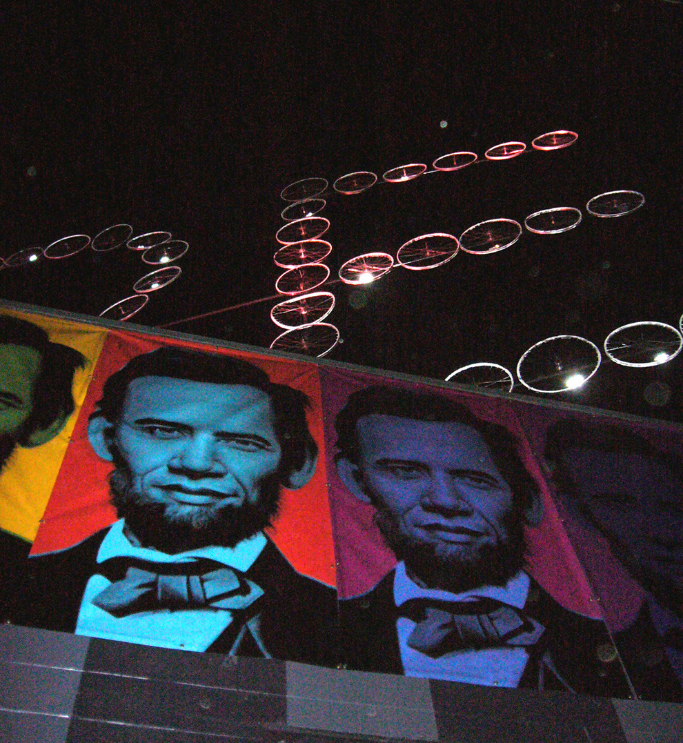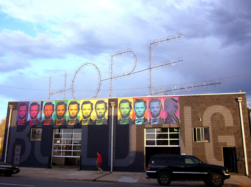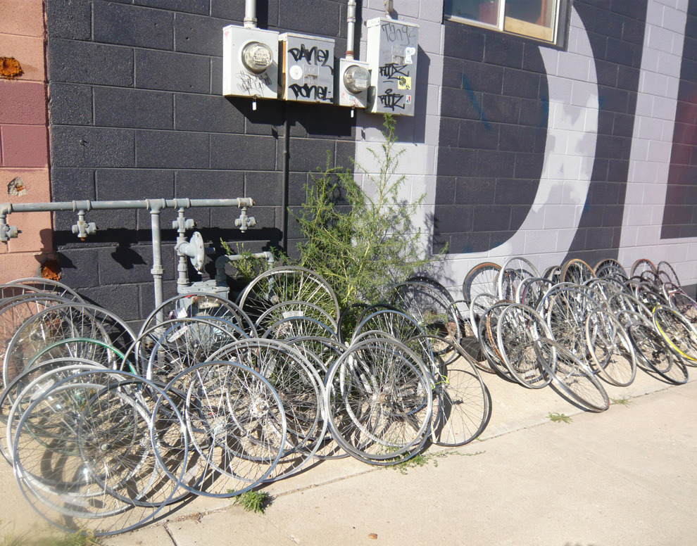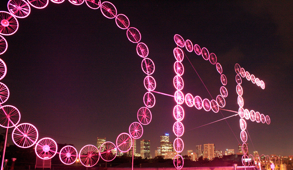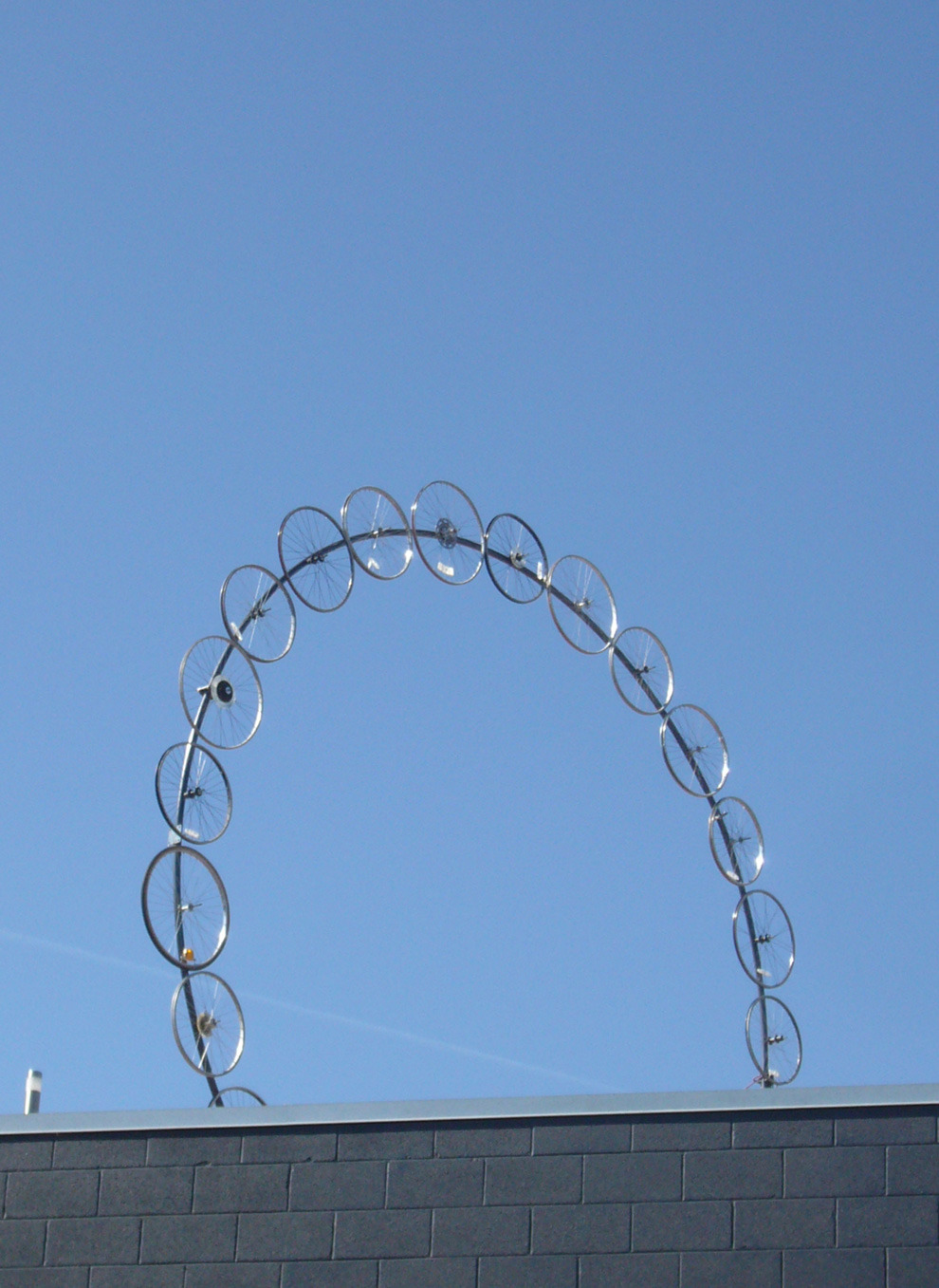 Wheels of Hope was an installation done during the 2008 Democratic National Convention in Denver, CO; a time of palpable, widespread HOPE during the concurrent presidential election. Bicycle parts were specifically chosen for use in the installation because of their energy efficient power to reduce dependency on fossil fuels and increase human health. This is still our HOPE for the future.
